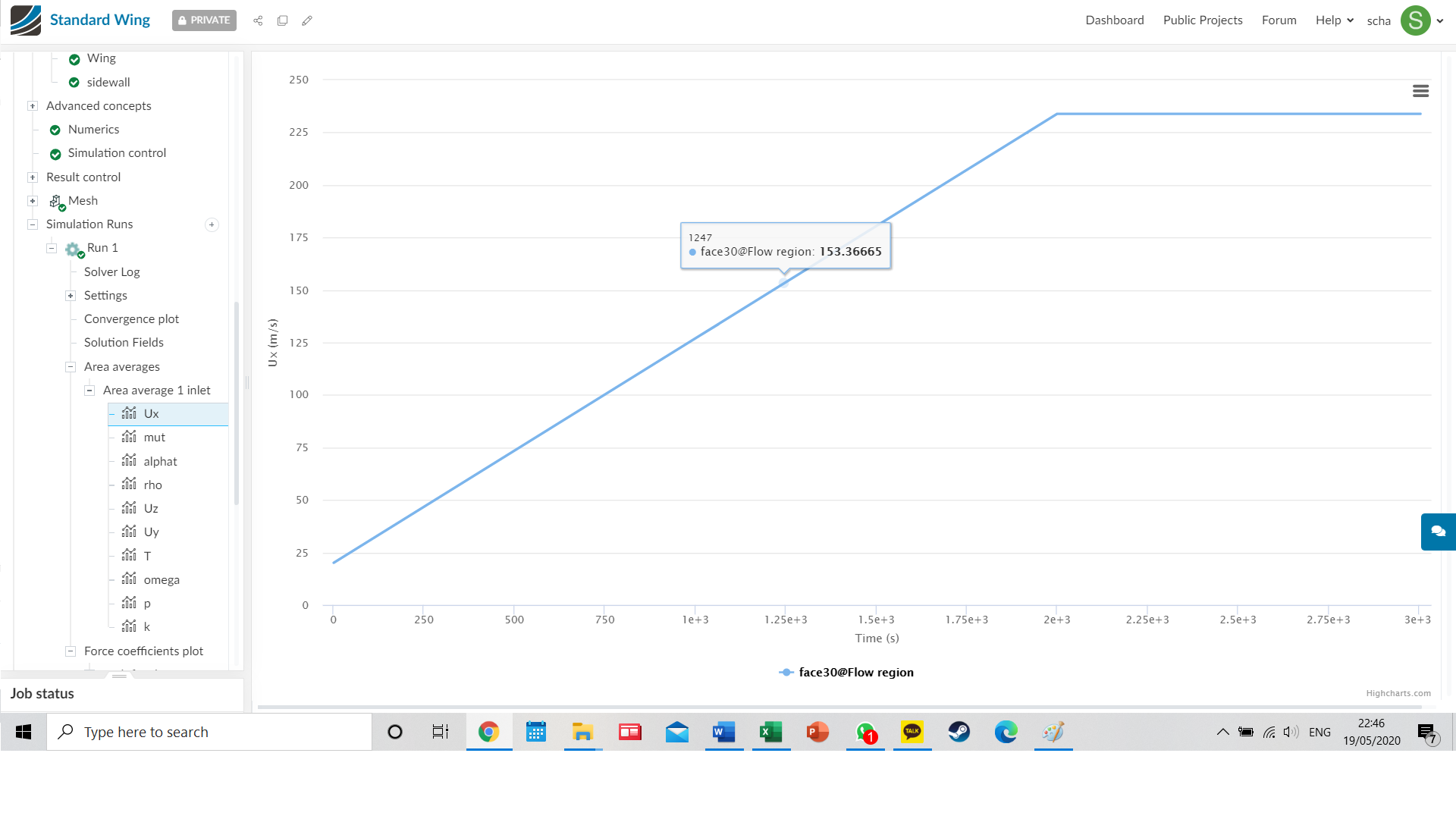 The analysis takes at high speeds 0.8 Mach, so as not to shock the solver, I have introduced a velocity ramp from 10ms at 0 t to 233 m/s by 2000t. Checking the inlet values, the speed has nicely gradual ramp to its final velocity. The force and moment coefficient also show very nice value…even after 2000t and all the way to the end of the simulation (3000 iterations).