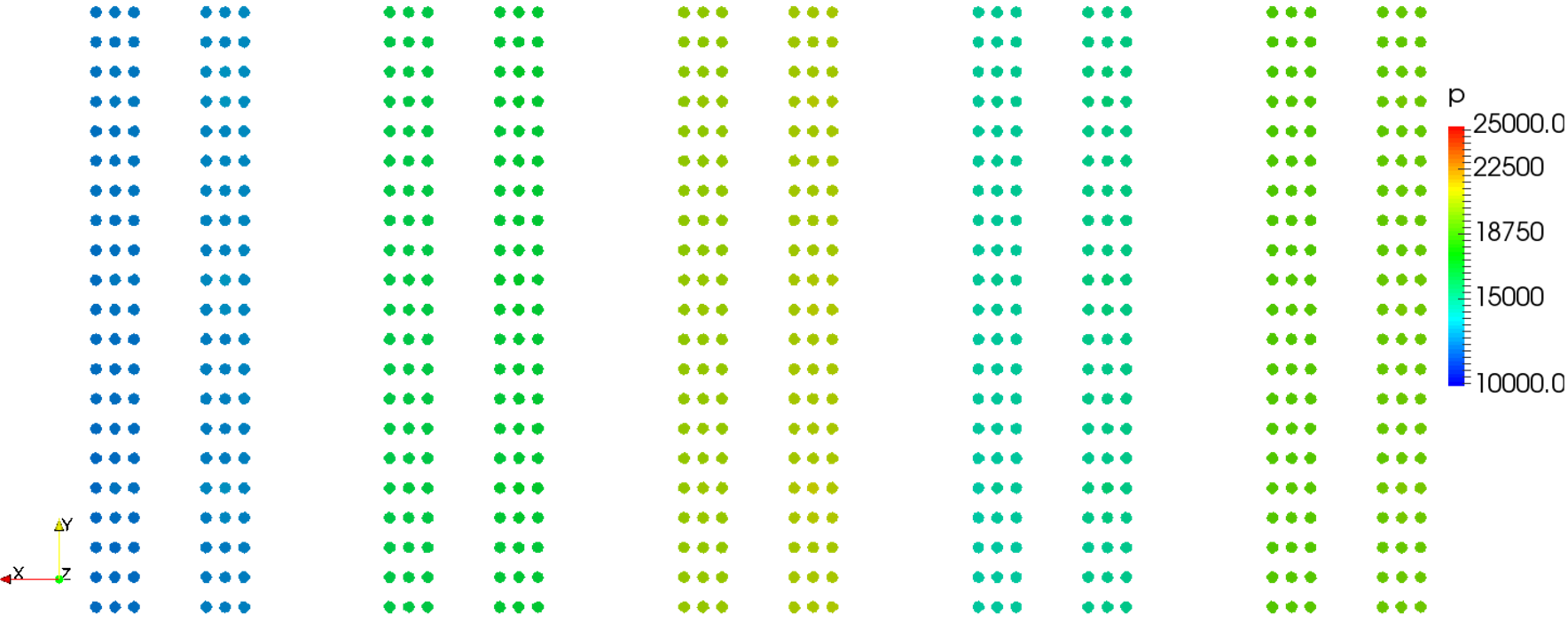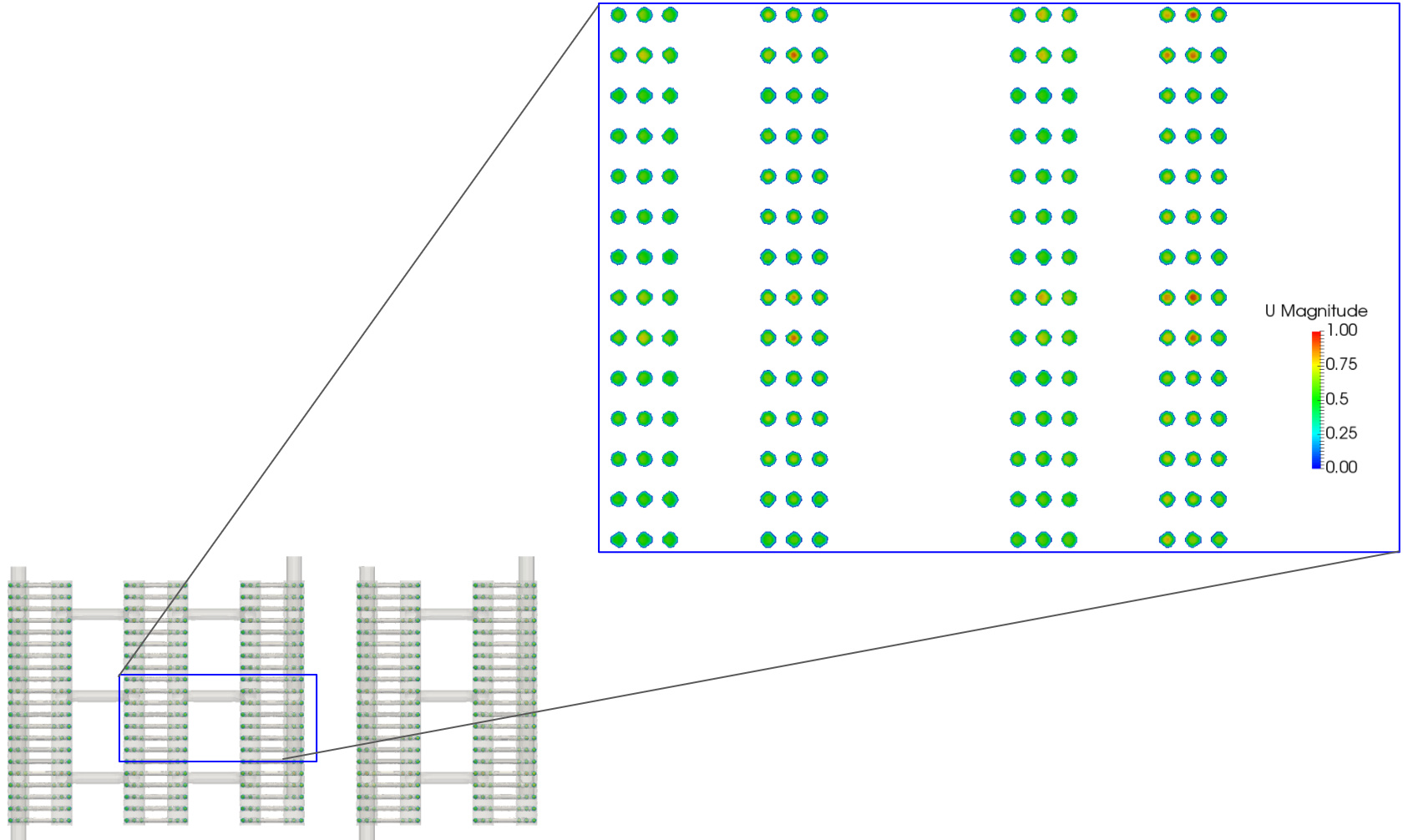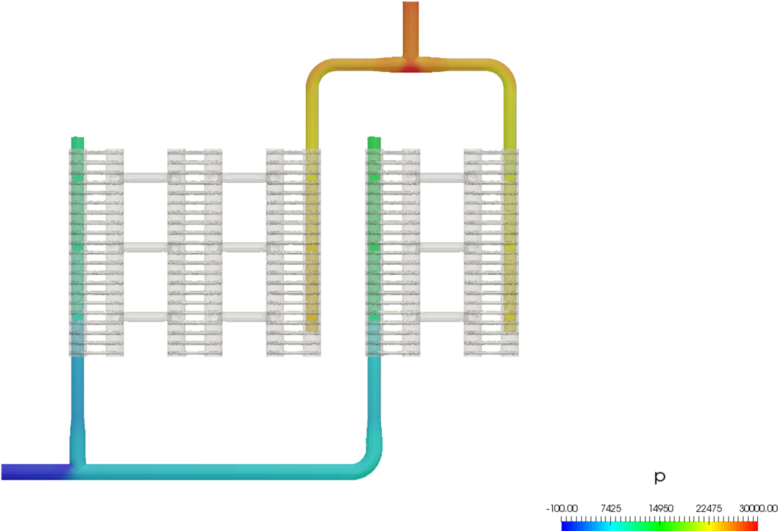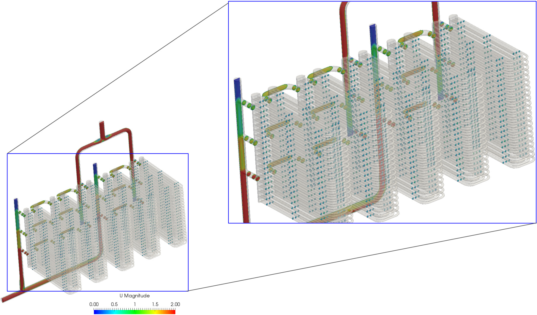 Taking a closer look a the velocity distribution, it can be determined that the mass flow is not evenly distributed across all the pipe sets. This provides a basis for further quantitative analysis.