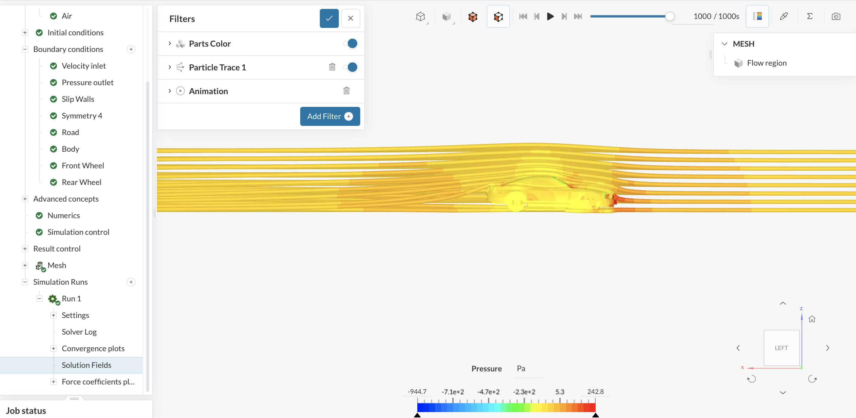 The issue is that there are some cells in the mesh that have really low pressure values, so if you check the latest timestep (520 sec), everything turns to red, as all of the cells have high values apart from these few problematic elements.