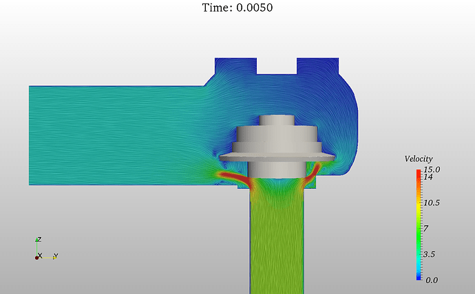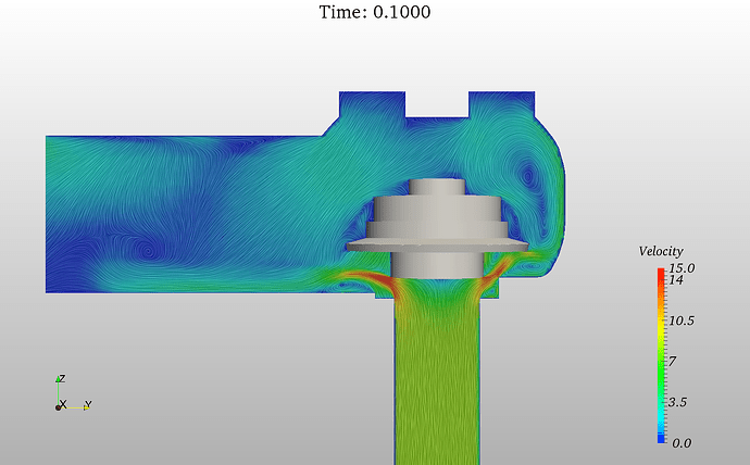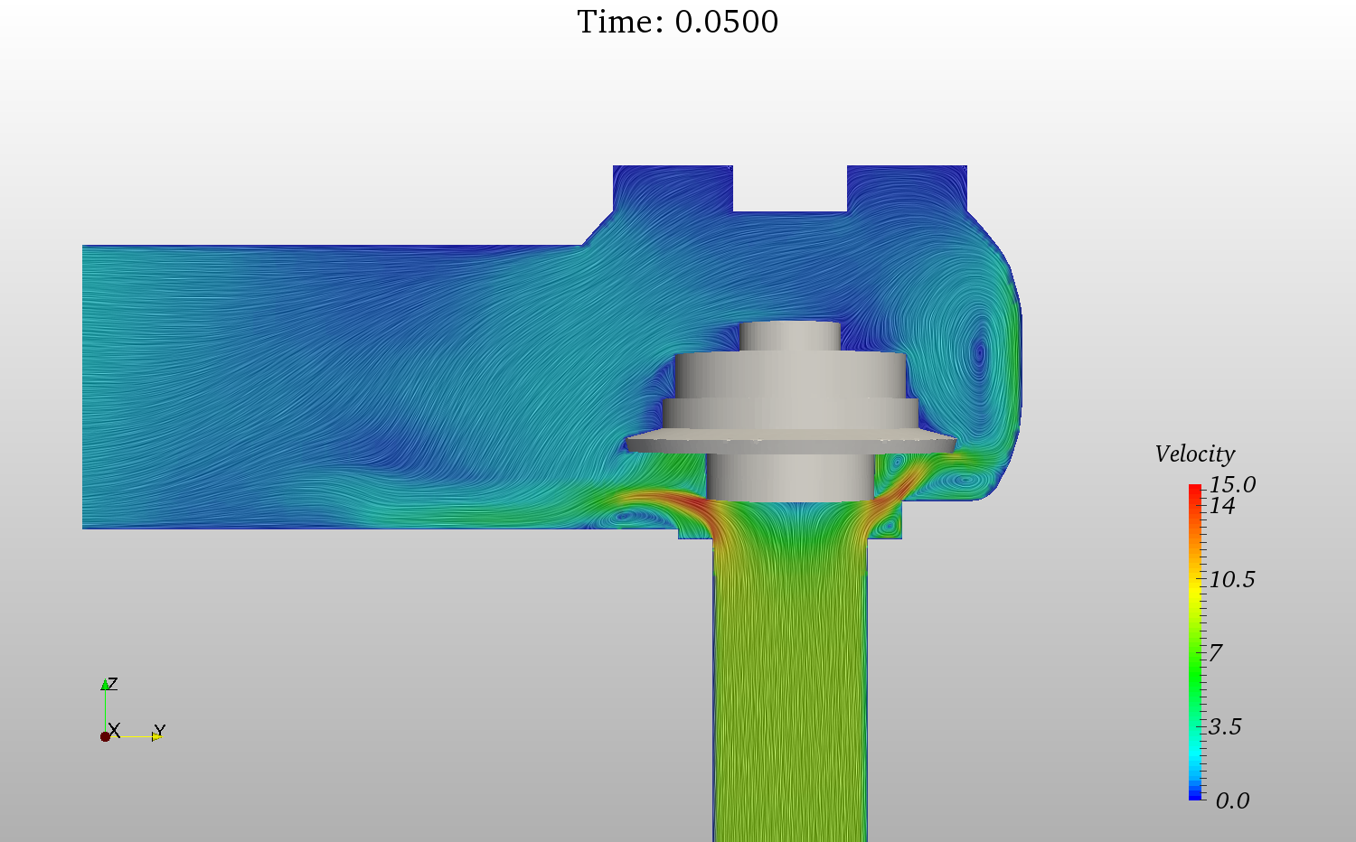 The simulation analysis the instantaneous flow field through the valve and the motion due to fluid pressure and spring restraint. The results below (processed on ParaView) show the transient changes in pressure and flow velocities and the motion of the valve based on the fluid forces. This study shows potential to improve and optimize the valve design and study the real time valve motion.