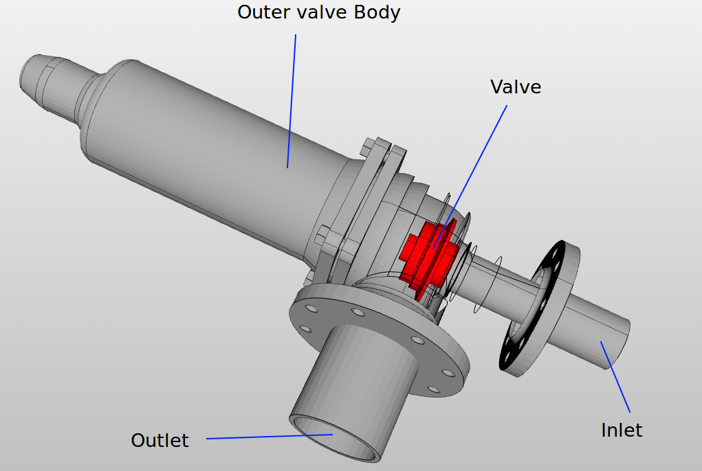 The geometry was simplified for this internal flow analysis and is shown in the figure below with the valve highlighted in red.