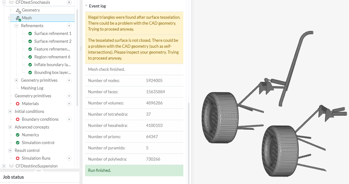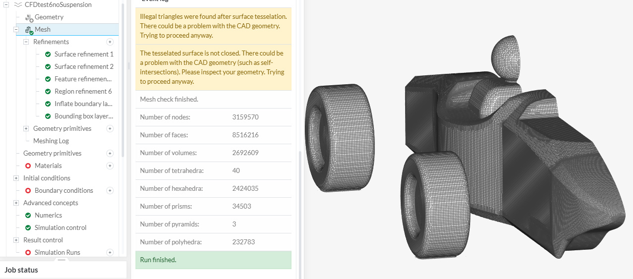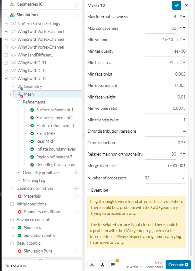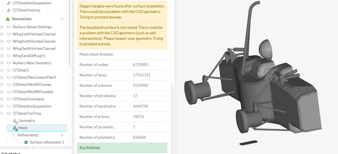Hello, I am currently making simulations for our FSAE team and i am having some problems with the mesh. I have already done about 8 successful meshes and simulations in the project links provided, one straight on and one cornering simulation. I noticed that some of the settings on simscale have changed and now the last 5 meshes i have done have failed. I am not sure what is wrong as the geometry hasnt changed much other then new aero elements and the meshes were ok before. Swttings are all the same. Can someone please take a quick look to see if they can find the problem.