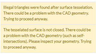 âHi Dan, Sorry for the late reply. This is a recent issue that some of our users are facing, we are looking into the problem and will let you update you soon. In the meantime, may I ask that you give your CAD model a second look? I noticed that the mesher does give an error as in the image below, please look for any open faces and self-intersections in the CAD.