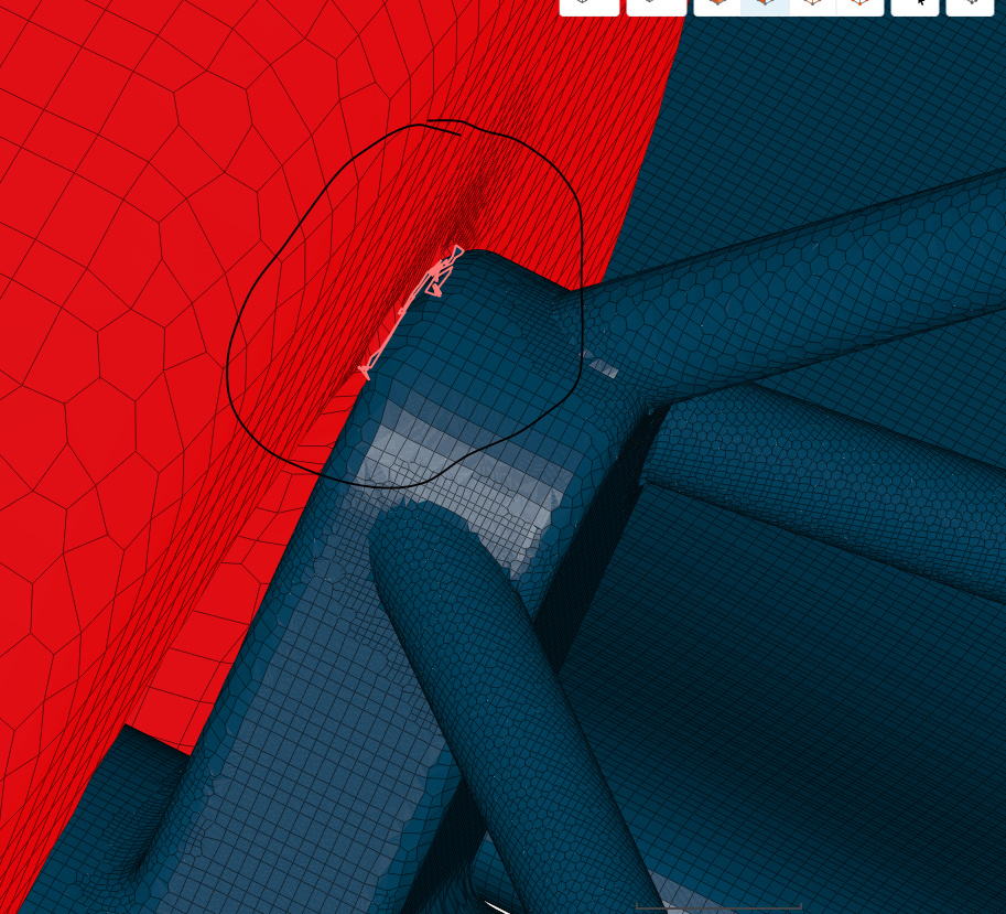 this is the biggest intersection problem i have had. Its not really an intersection but the parts are so close to each other that the mesh thinks its one part and tries to close it. i am working on fixing this in the geometry but so far has not led to any failed meshes (until the last couple i have tried)