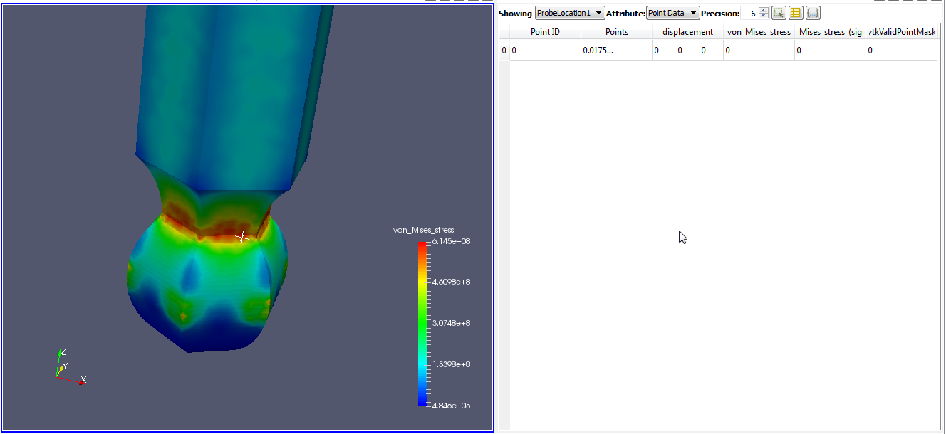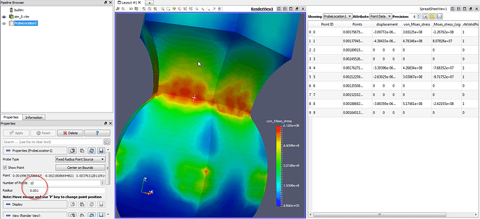 From now on you have two possibilities. The first one: you can pick up single points and get readouts of all simulated parameters (exactly like in the picture). This is in my opinion the most convenient approach. You click “d” button on your keyboard (shortcut key), select mesh point on a surface and all relevant data will display in a SpreadSheet view. Then “d” again and next point appears.