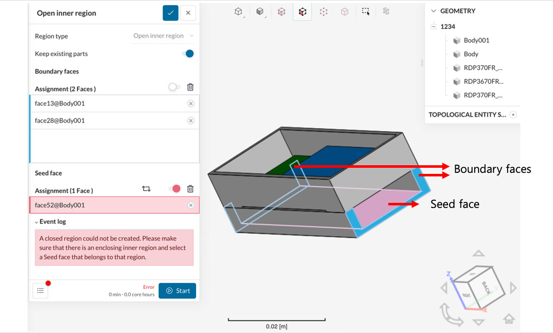 I used the CAD mode to first combine the two bodies, and then create an internal flow volume