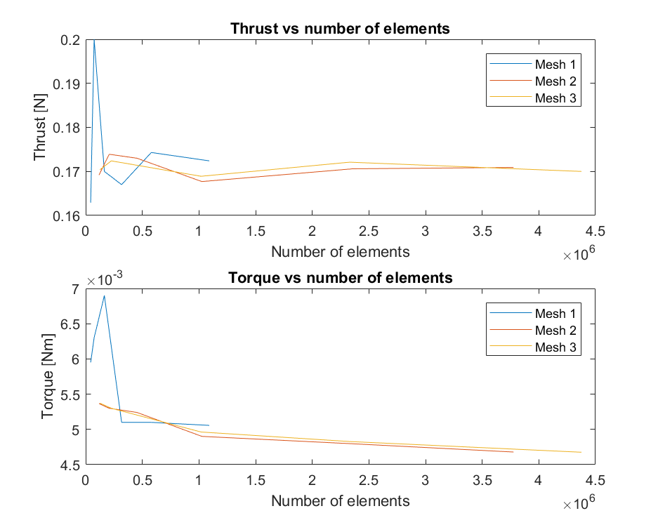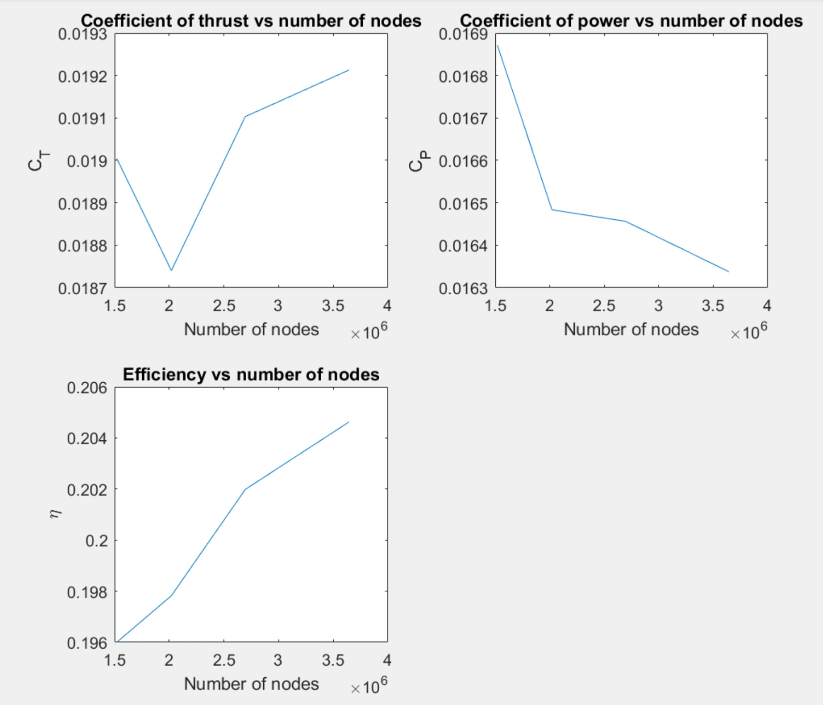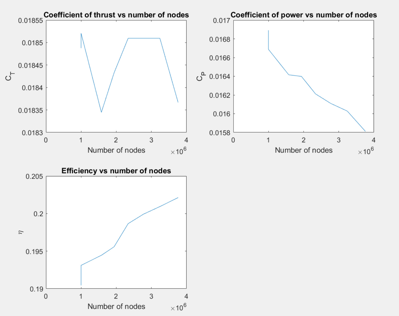 Since I wasn’t able to get sufficient refinement around the leading and trailing edge, it was decided to remove the inflate boundary layers entirely, and have a very fine surface refinement on the propeller blades instead (level 9-9). Other then that the setting were kept as one the first study. However, this study started with a base mesh box at 13^3, then 15^3 and then 17^3 and so on.