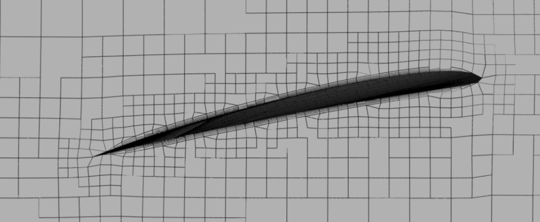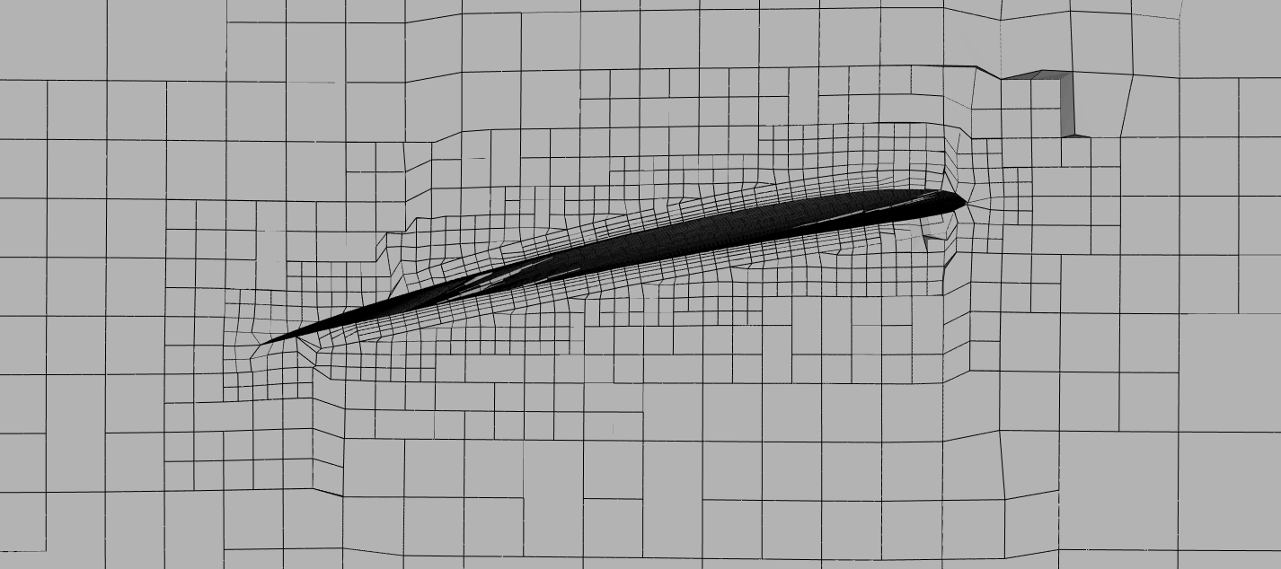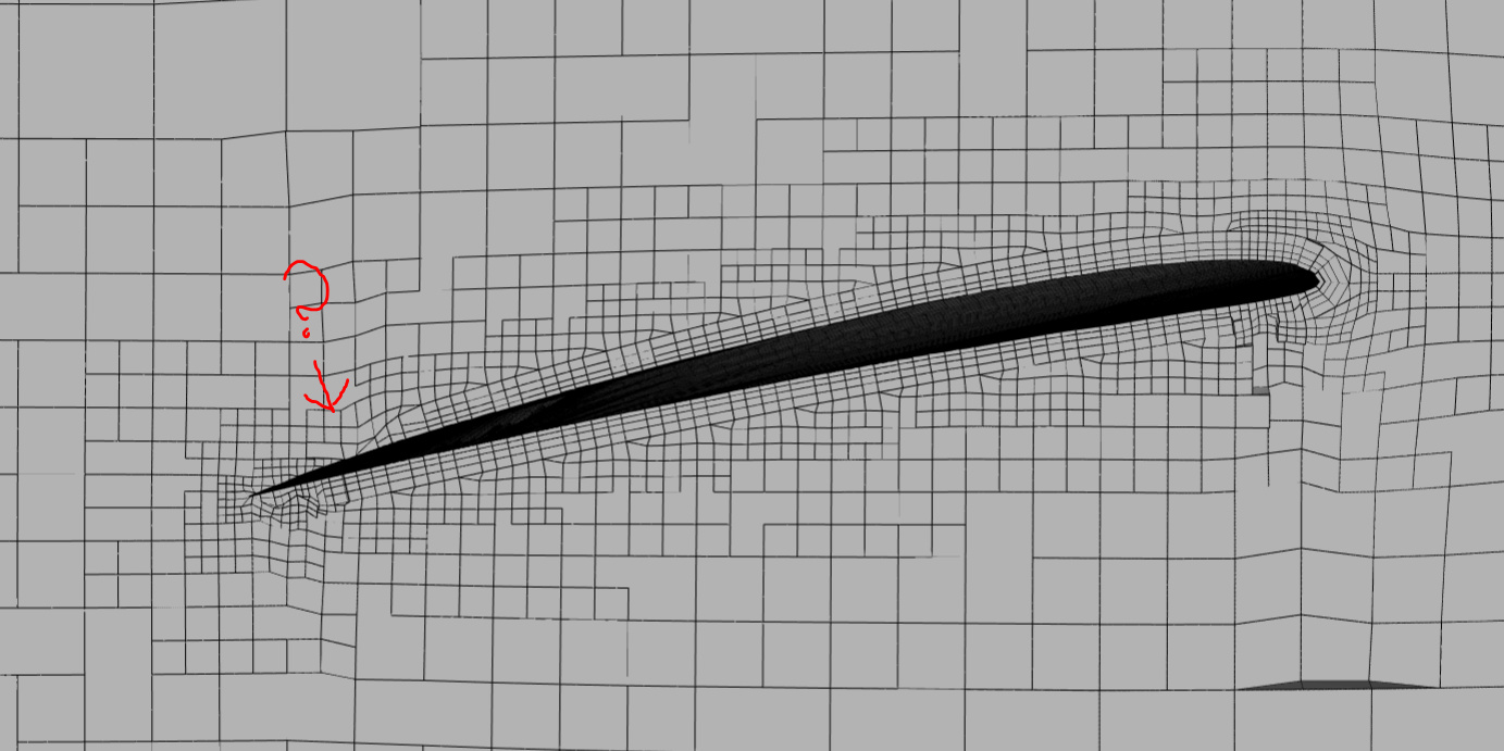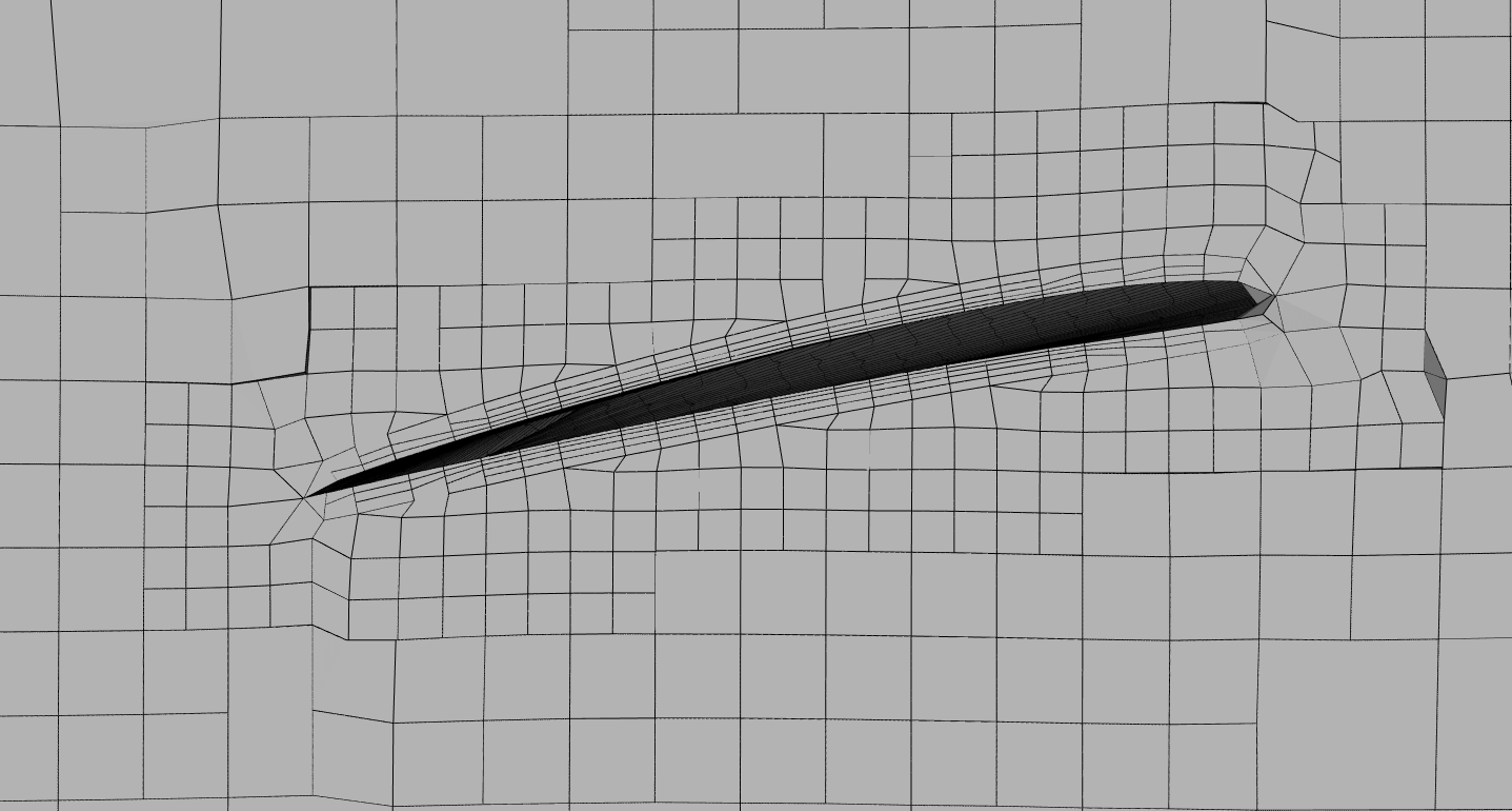 The problem with this mesh was that I didn’t manage to get any refinements around the leading and trailing edge. I know that feature refinement might be a good approach to solve this, the problem is that feature refinement seems to refine the edges of the rotation zone as well, which is very computationally wasteful.