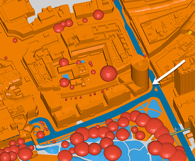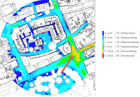 The figure below shows a proposed site layout for a project in the city of Bristol. let’s Imagine that you are the designer of this site and you want to run a pedestrian comfort analysis to understand if this site layout would suit the needs of the client. The client did specifically mention that just outside the cylindrical high-rise building he would like to open a coffee shop. This implies that the comfort in that area should be suitable for outdoor sitting.