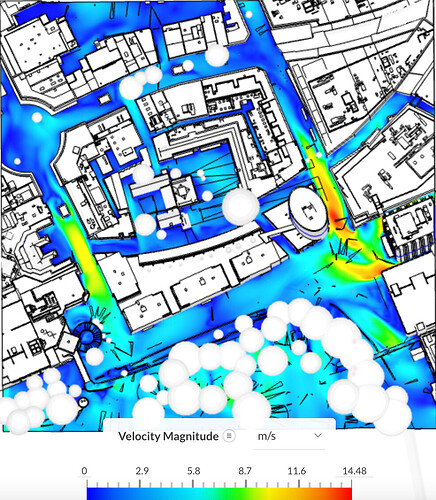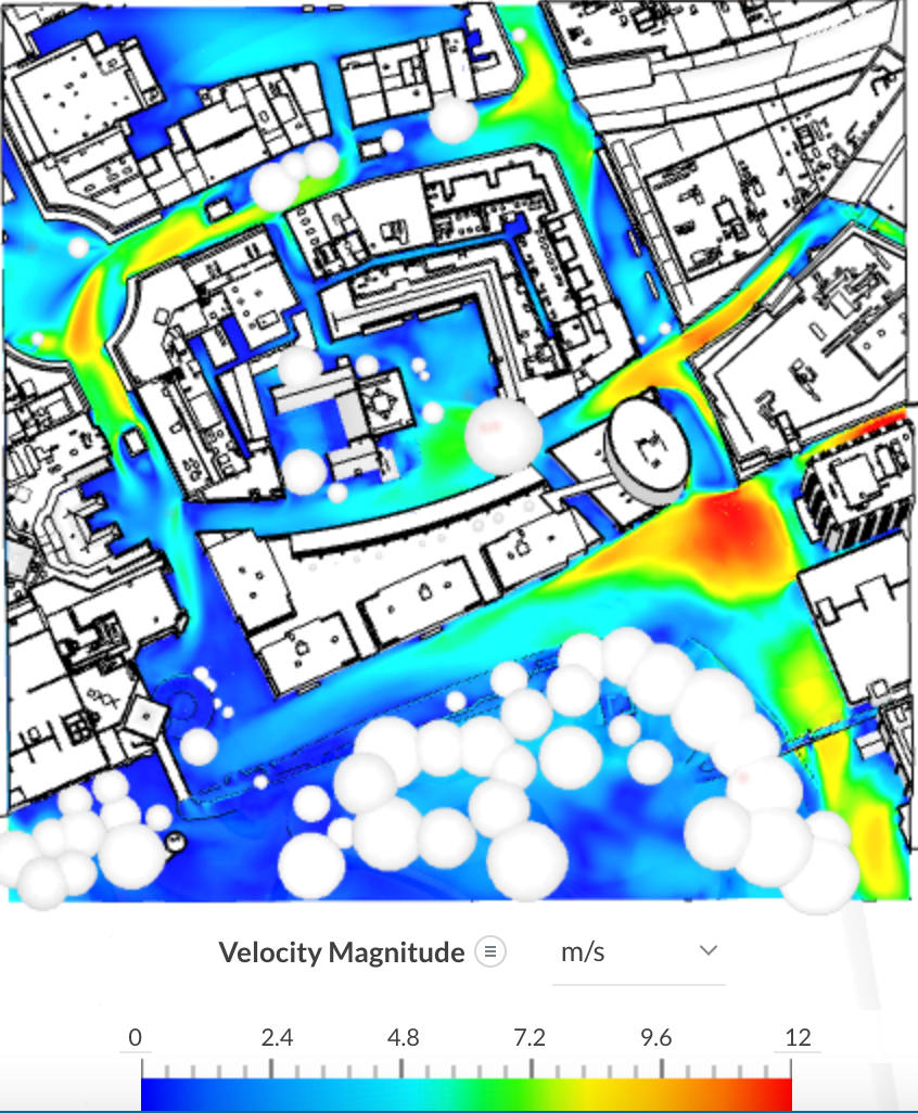 For each of the steps above one can investigate the velocity field and inspect its associated values either through the numerical legend or by inspecting points. This allows the user to quantify and understand the wind direction that causes the highest velocity flow in the region of interest. Essentially, leading the designer to think of the appropriate wind mitigation strategy (if needed) to satisfy the objective of the analysis.