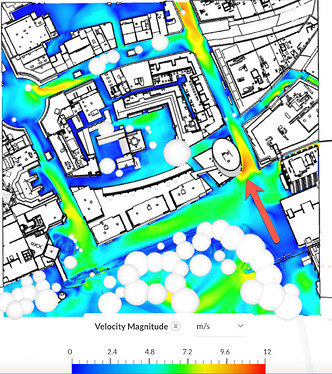 Inspecting the averaged velocity results associated with this wind direction as shown below, we can clearly identify one reason for the cause of discomfort in the area of interest. The air accelerates due to a cornering effect as it passes the cylindrical building.