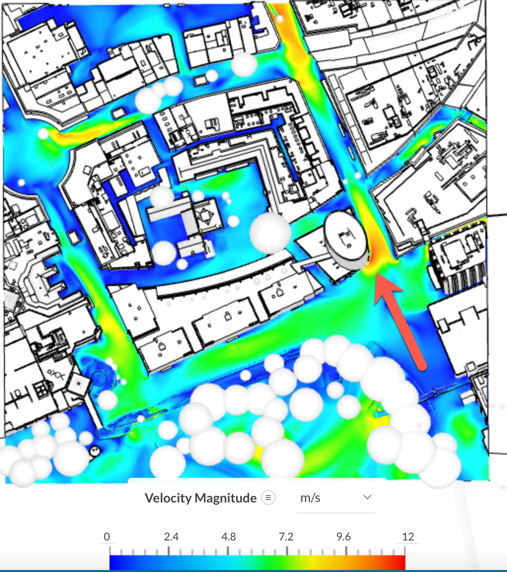 - Investigate the velocity field of the wind direction that is aligned best with the area of discomfort. An example of this would be the southerly wind as it aligns more or less with the path of the discomfort area. We can clearly see a high velocity region just infront of the area of interest due to mainly an air channeling effect.