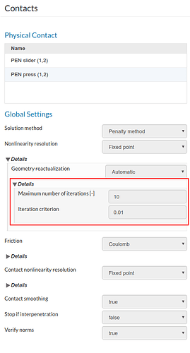 I decided to revive this old project after taking a long break from simulation problems in general due to being very busy with experiments. This time i want to move the “pressing plate” horizontally, sliding against the spring, in contrast to pressing the spring from the top (see the last simulation, “Type 2 gap 2.5mm no fric”). After making a new CAD model and mesh, i tried to set up the simulation, first without any friction. However, i run into a “singular matrix” error, and would be thankful if anybody could give me a hint how to fix it (and maybe additional optimization hints/ideas). Any help would be much appreciated!