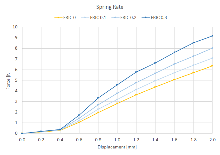 I’m not sure what the friction coefficient for beryllium copper on steel is. As such I have run your simulation with three levels of friction. The results are shown in the plot below. This plot shows the sensitivity of the system to the level of friction.