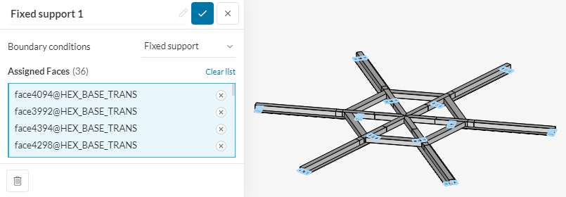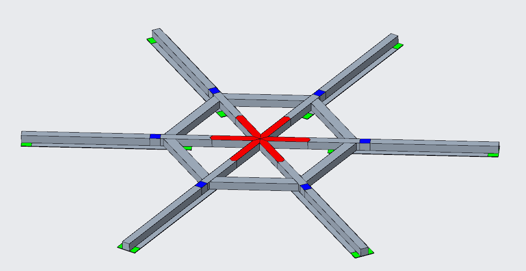 Basically there are some remote loads at above the base which have as assigned faces the areas where the turbine tower and the base meet (blue). The tower weight is applied over the blue areas too. Then on top of the base the generator is installed so the weight is applied as a mass over the area around the center (red).