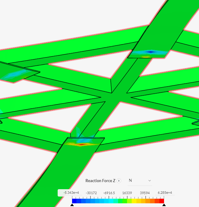 The results I am getting on the solution field make sense in terms of where the positive and negative forces appear, but I am quite unsure if I should take those values or if they are a result of a stress concentration from the simulation, as they are much higher than expected.