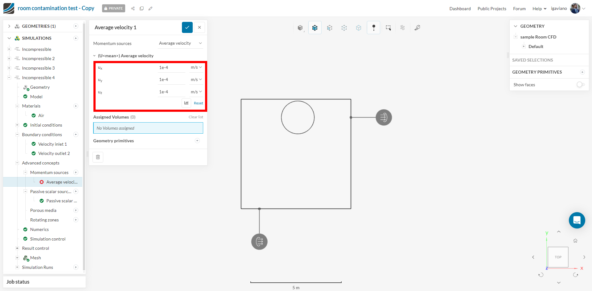 In my room contamination test simulation, the cylindrical bodies represent the non-physical contamination zones. So, I wonder if my setup of momentum sources and passive scalar sources is correct?
