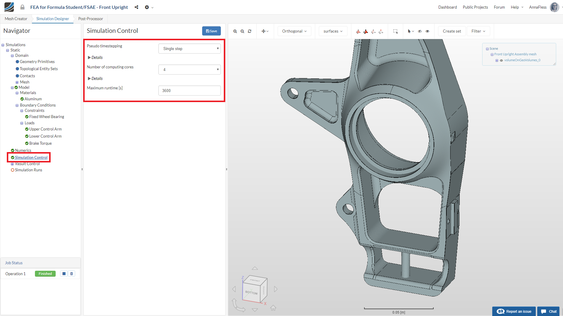 Click on Simulation control. Since we are doing a linear static analysis, the applied load does not vary based on time and the inertial and damping forces are ignored. This means that we can set up and run our simulation under a single timestep