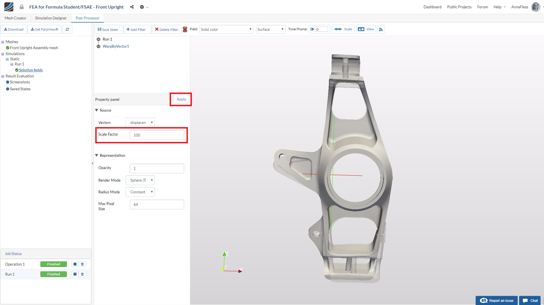 The actual deformation of the aluminum upright should be very small. To better visualize the direction of deformation, we can introduce a Scale Factor of 100