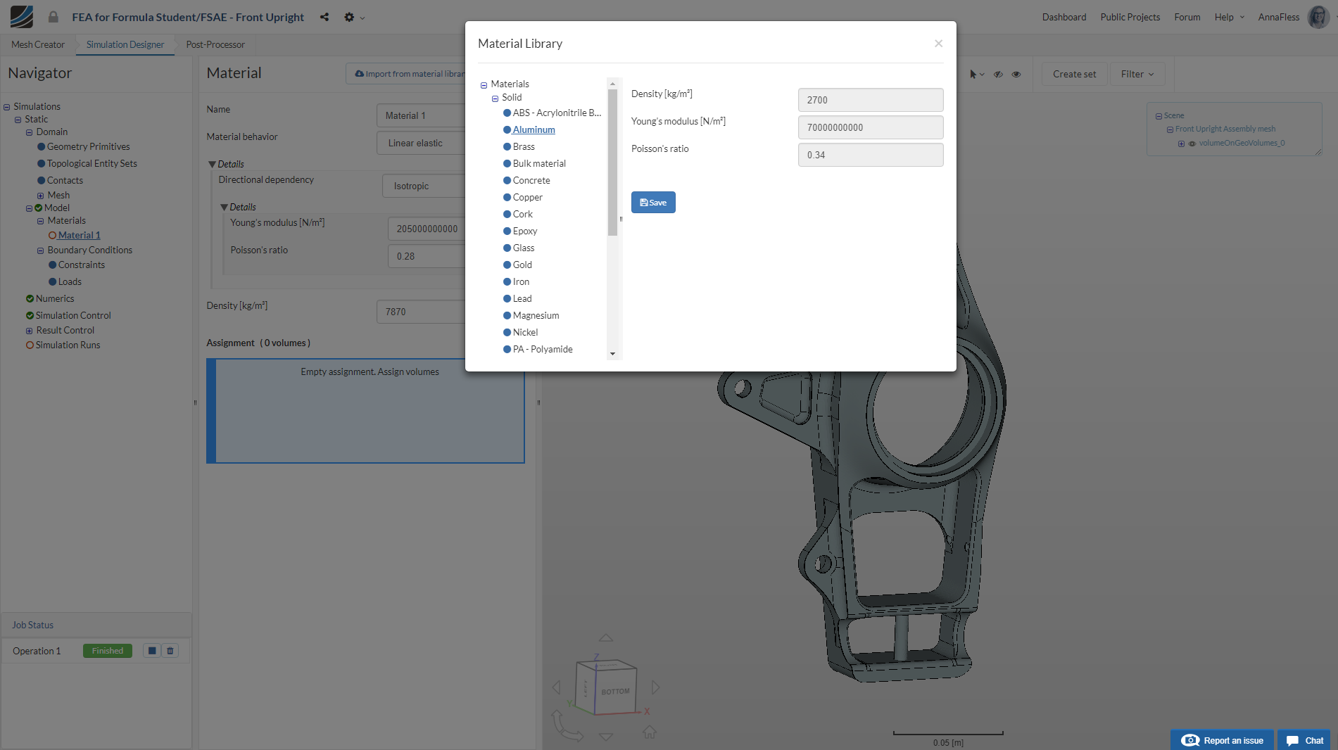 Now we will define the material for the front upright. Select Material in the Navigator and click New.