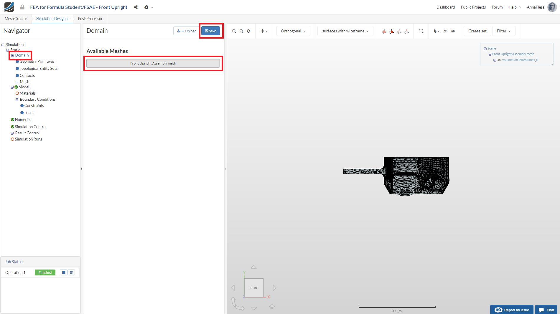 Click Domain from the tree and select the mesh that you created. Click the Save button. The mesh will then automatically load in the viewer.