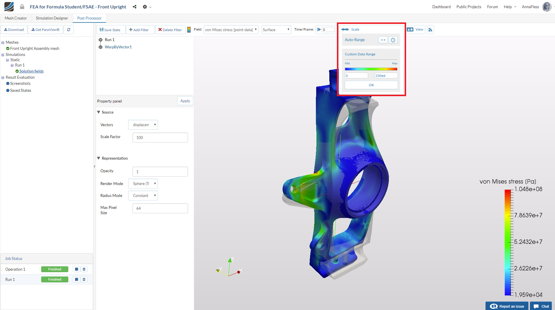 Click on Scale and set the custom data range from 0 to 250e6 Pascals (the upper value in this range is the yield stress of aluminum - or the stress that the material will start to fail.)