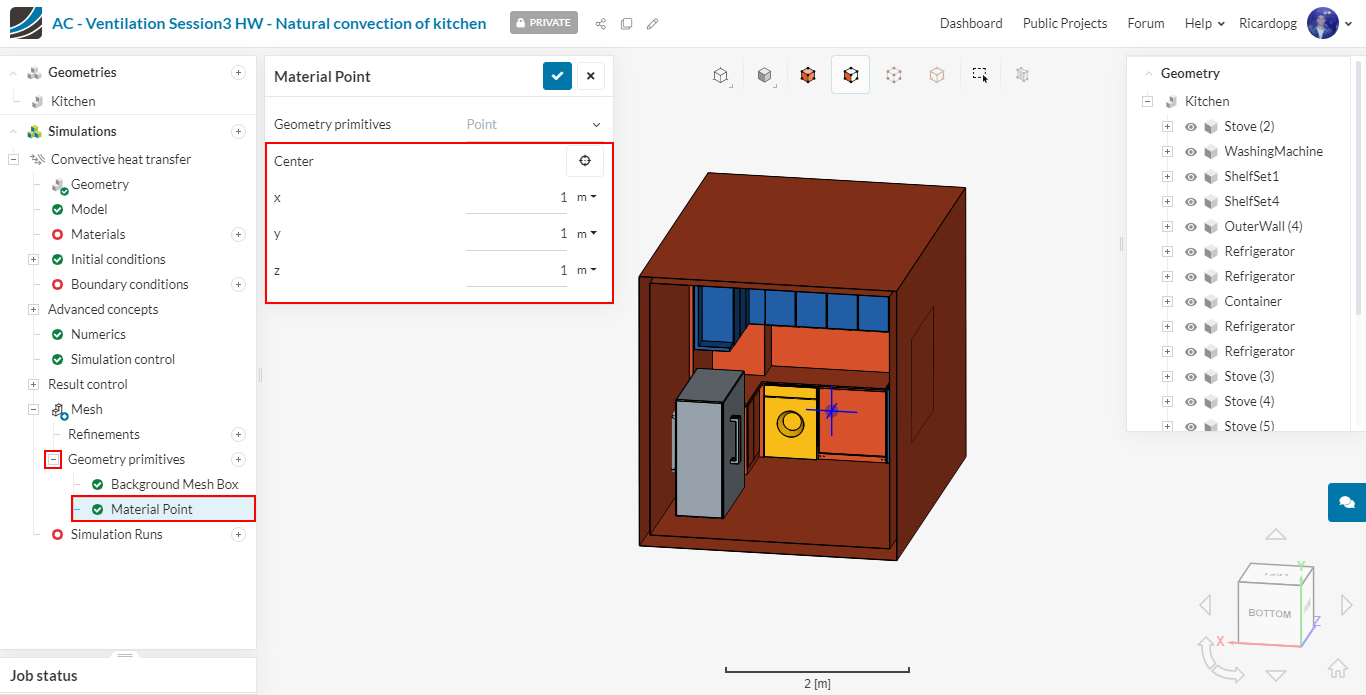 Only Material Point has to be adjusted. You can place it anywhere inside the region that will be meshed (so, in this case, anywhere inside the kitchen room). For example, the coordinates (x, y, z) = (1, 1, 1) are good.