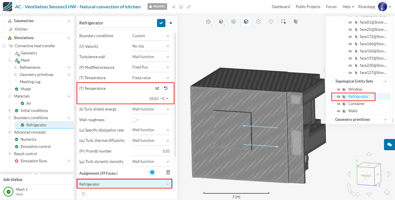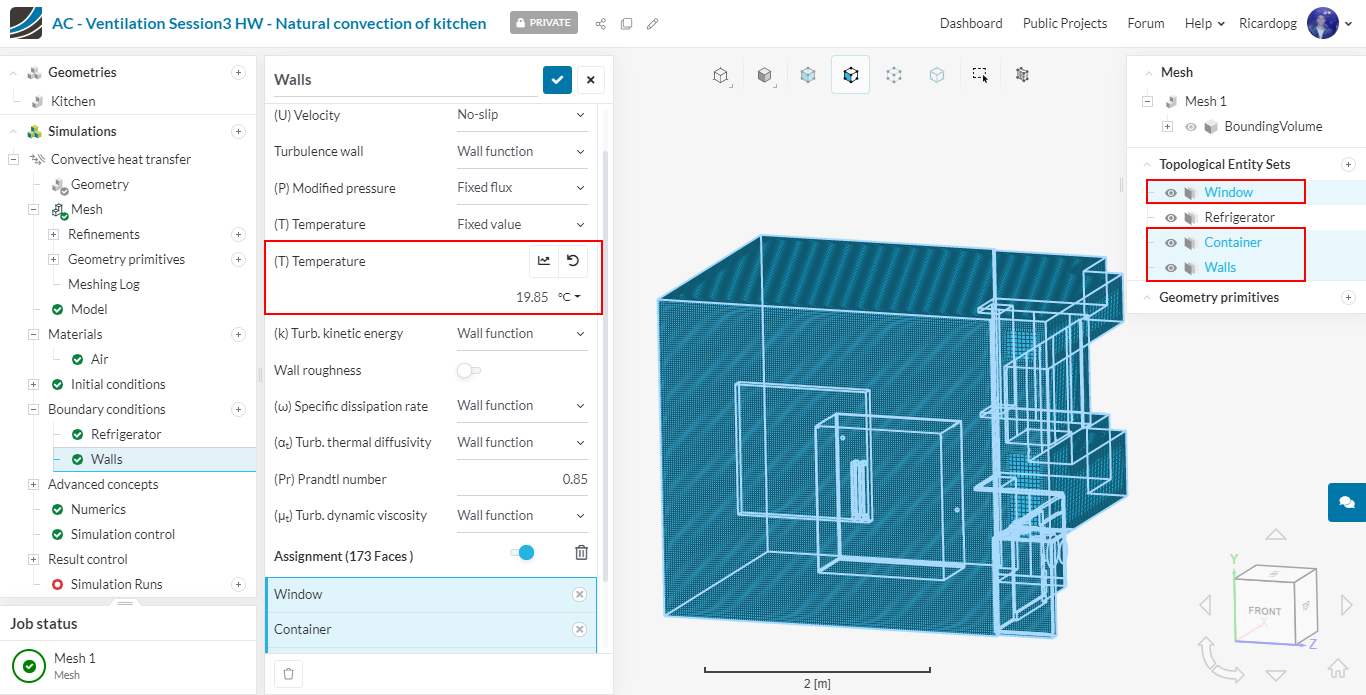 The Walls boundary condition is also custom. It has the same settings as the source boundary condition previously created, except for the temperature value. Walls will have a fixed temperature of 19.85 Celsius. Assign it to the following entity sets: Walls, Container and Window: