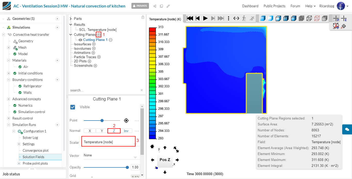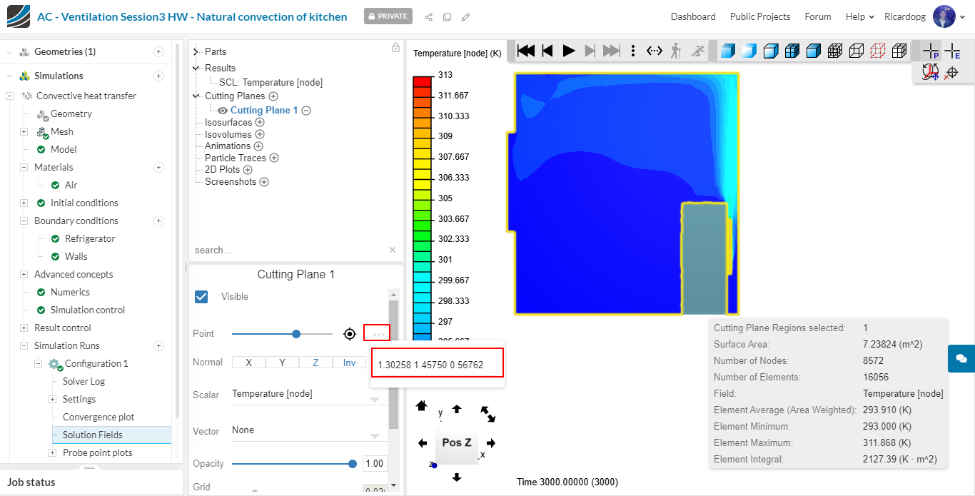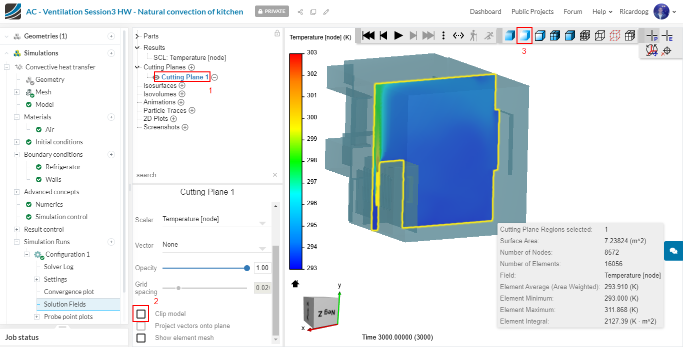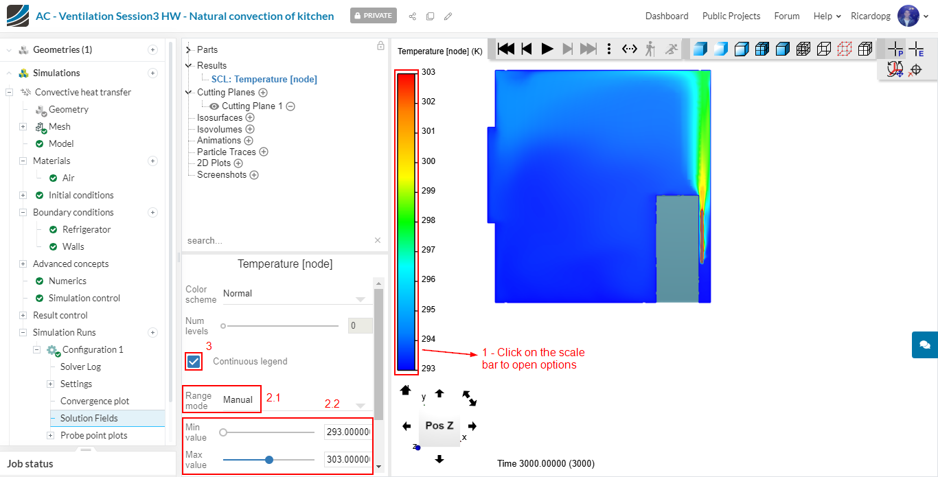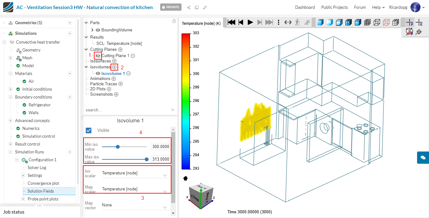 Click on the “eye” next to the cutting plane that you created to hide it. We will now create an Isovolume. The isovolume is a volumetric representation of a certain property in a determined range. For instance, select Temperature [node] for both Iso scalar and Map scalar. Adjust the range from 300 to 313 K: