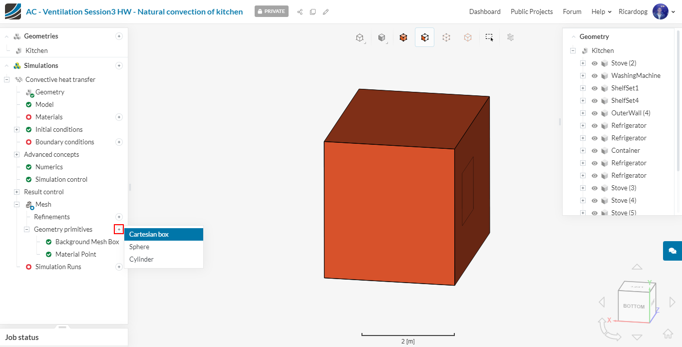 We will create a cartesian box geometry primitive. It will be used later on for a mesh refinement. To do that, click on the + icon next to Geometry primitives and select Cartesian box.