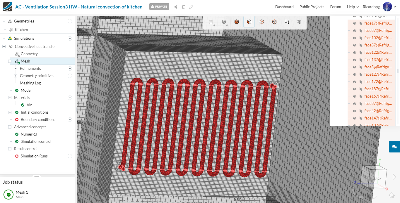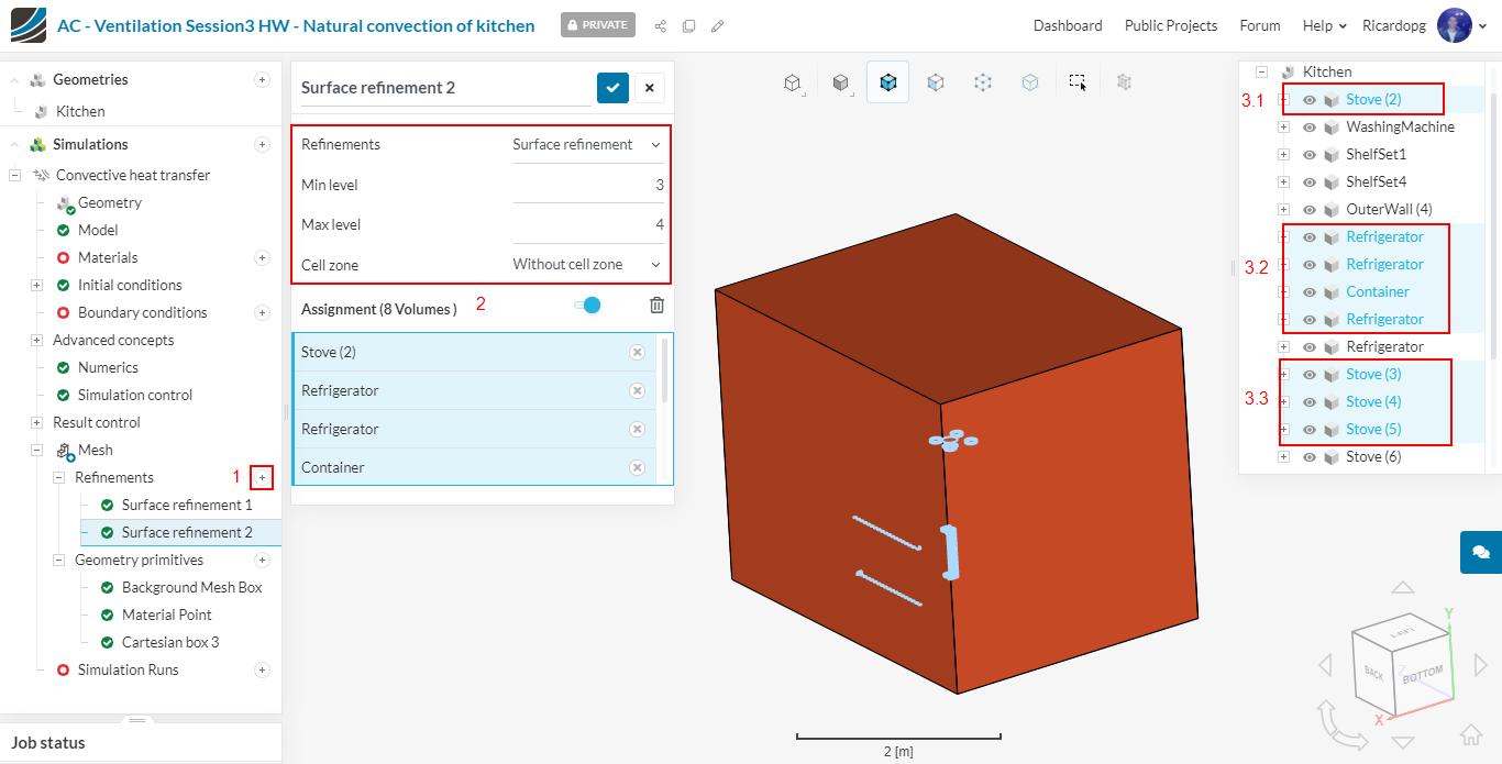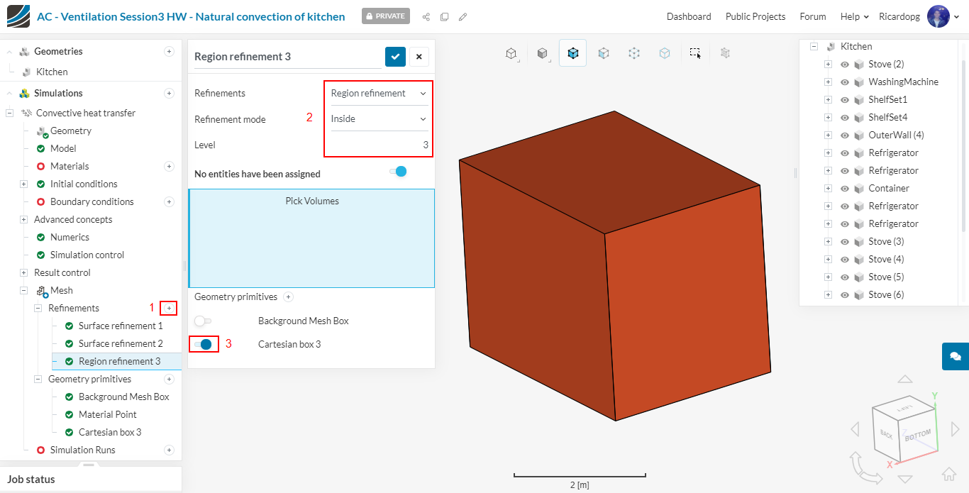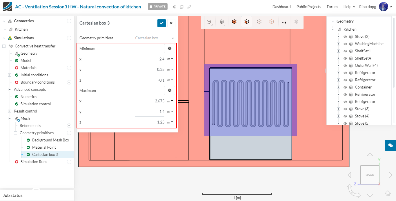 Using the previously created cartesian box, we will create a Region refinement. It will be used to get finer cells close to the heat source (refrigerator coils):