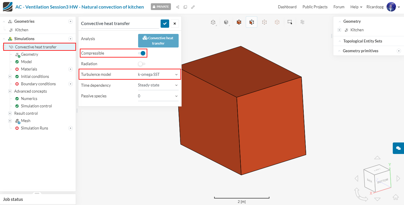 On the top of the tree, we can find some modeling options for our convective heat transfer analysis. For this one, we are going to use a k-omega SST Turbulence model and we are going to consider our fluid to be Compressible. Despite the fact that air is at low speeds, relatively small changes in temperature can produce relevant changes in density. Having the Compressible switch on means that we are not using the Boussinesq approximation.