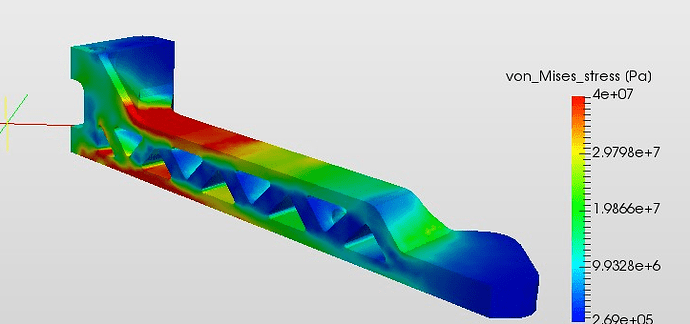 Factor of safety with yield stress 40MPa and a custom range to have a better visual feedback (blue=broken)