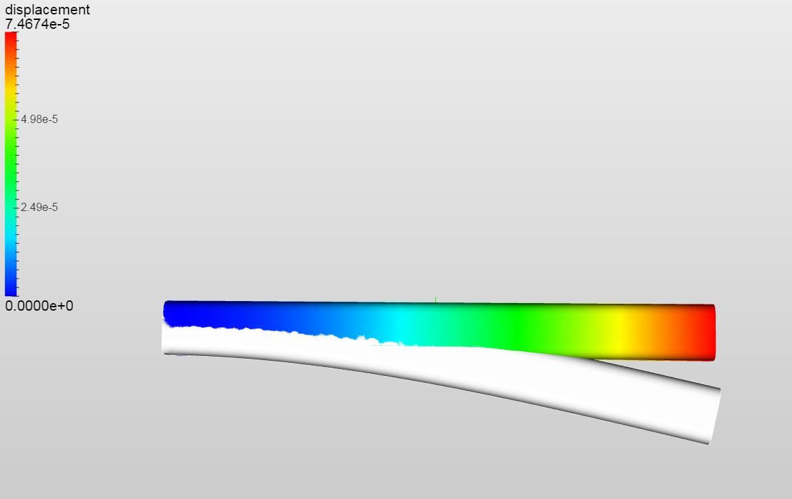 First of all a hint regarding the units of your result. SimScale handles the geometry in meters which means that in your case the result is 1.194e-3 m, which is a larger displacement than the 7.4e-5 m that you were expecting. So where does that result from?