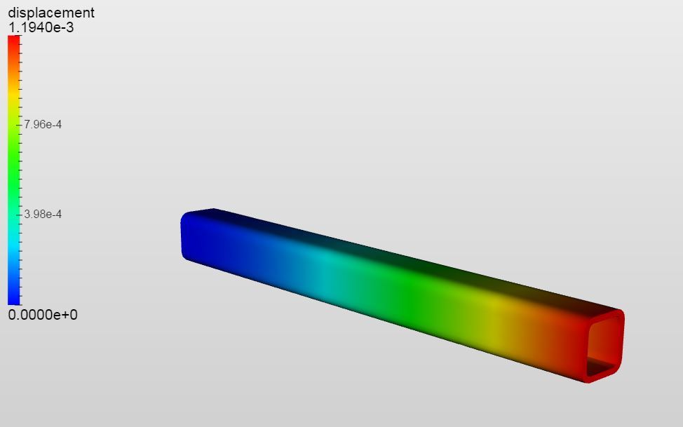 I have made a simple Bending Analysis for a struktural tube 50x50x5 with 500mm length. The tube is fixed on one side and bears a load of 100N on the other side (at the edge - nodal load). It results to a displacement of 1.1940e-3 mm.