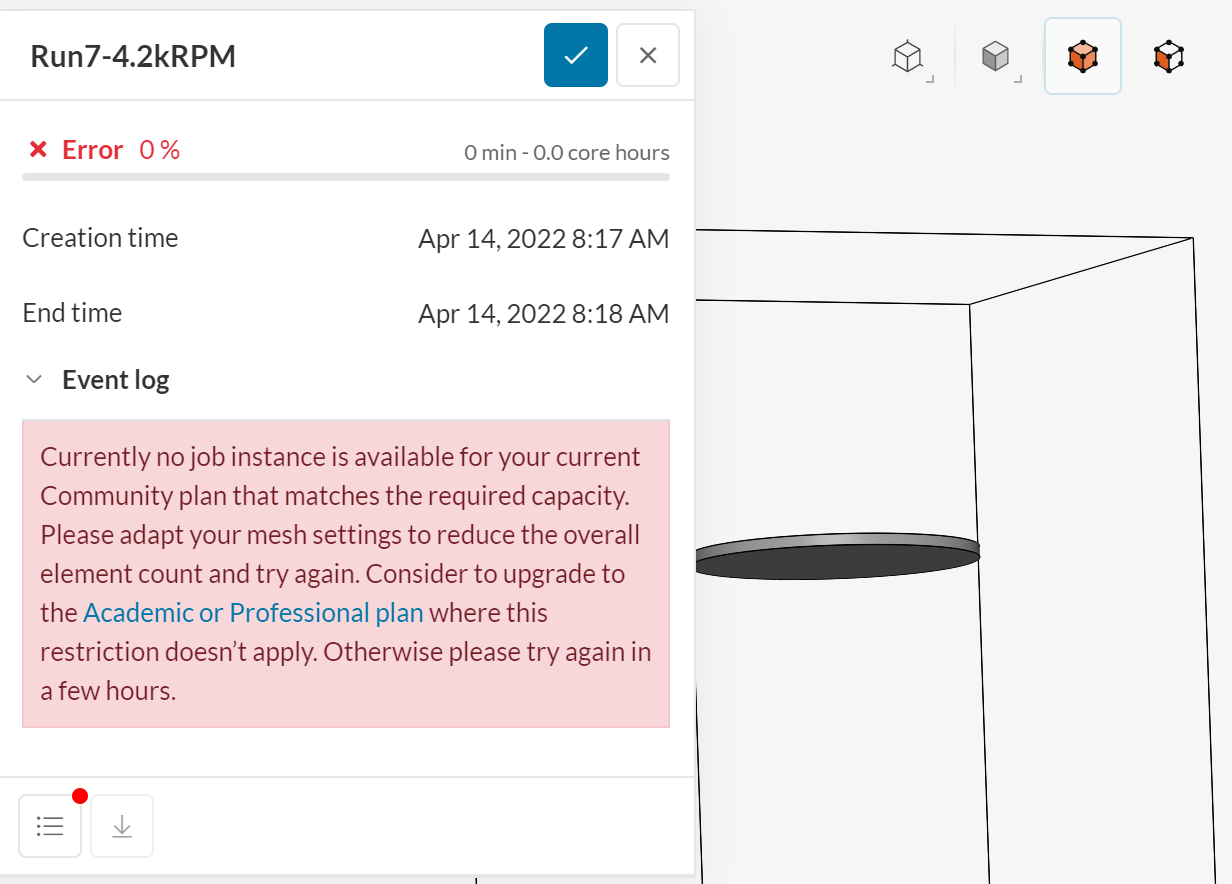 Currently no job instance is available for your current Community plan that matches the required capacity. Please adapt your mesh settings to reduce the overall element count and try again. Consider to upgrade to the Academic or Professional plan where this restriction doesn’t apply. Otherwise please try again in a few hours.