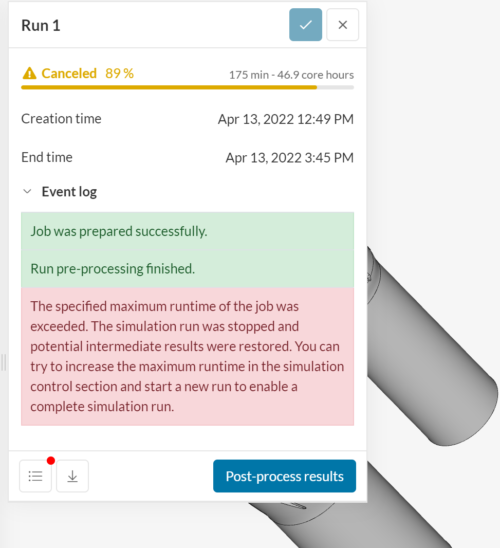 The simulation was cancelled due to an error related to the length of the maximum runtime, which was set to 1e4 seconds under ‘Simulation Control’