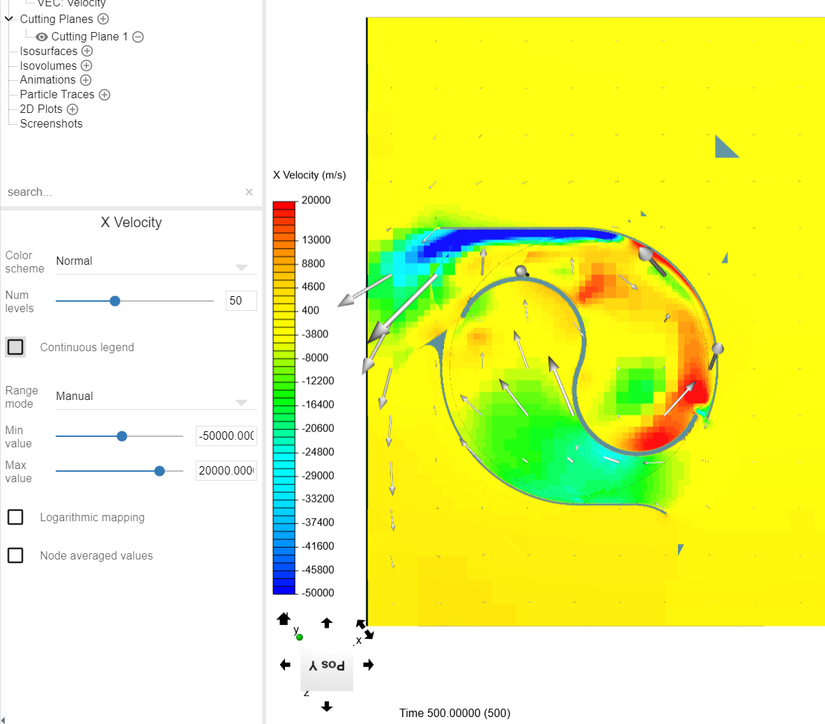 Using your cutting plane I can see X speed from -50 to +20 km/s, which is quite impressive. You see your Savonius turbine compressing air against the flow direction.