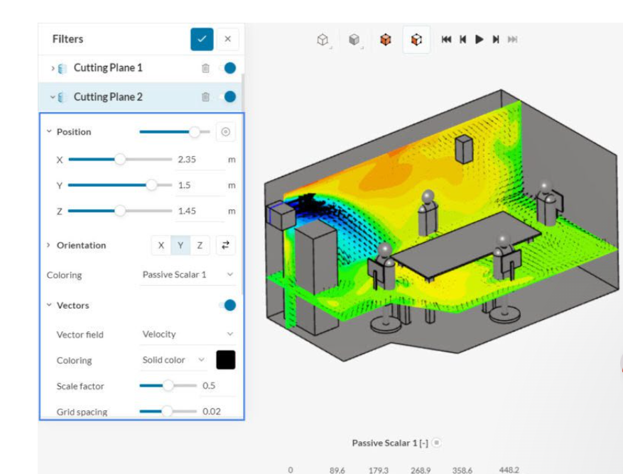 as i understand this simulation result, the indication of air from the ventilator is supplied throughout the meeting room. The colour grading indication of Temperature ranges are also present.