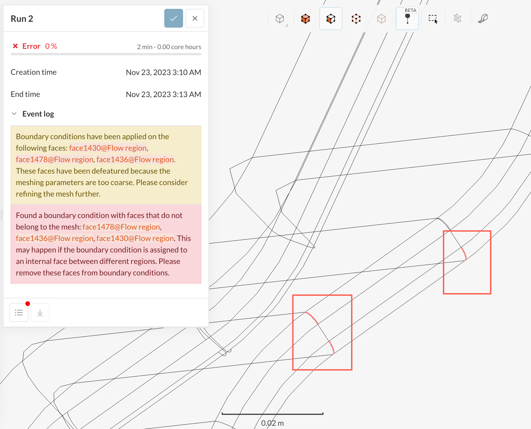 "Boundary conditions have been applied on the following faces: face1430@Flow region. face1478@Flow region, face1436@Flow region. These faces have been defeatured because the meshing parameters are too coarse. Please consider refining the mesh further.