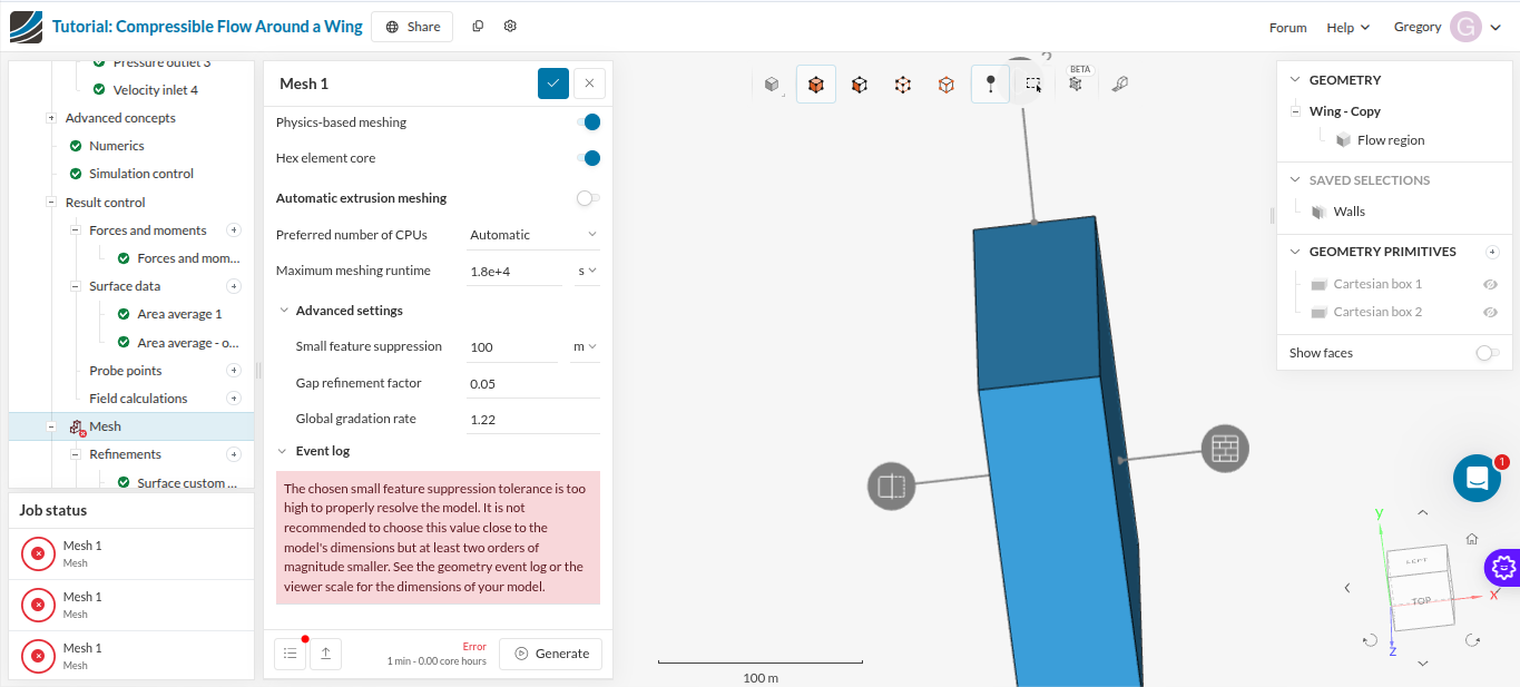 The tutorial suggests a small feature suppression (which is the smallest cell size globally) to be 1e-5 meters. Is there a particular reason for using 100 meters?
