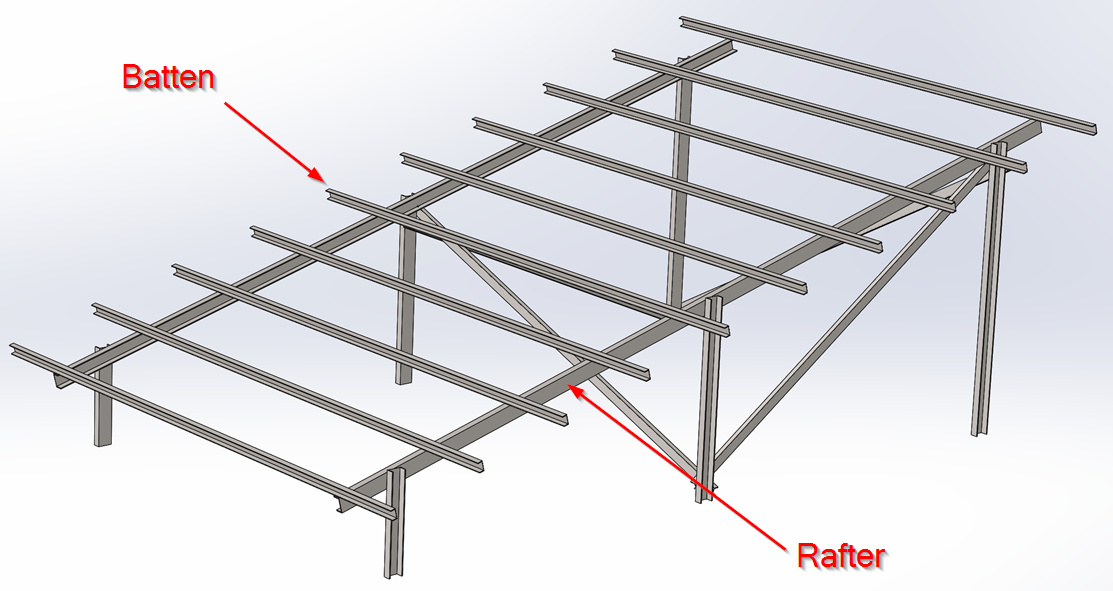 The spacing of your rafters is a little more complicated. You can either use large battens with wide rafter spacings or small battens with narrow rafter spacings. If you what to optimise your structure for cost will will need to experiment with different combinations and see which one turns out to me the most cost effective.