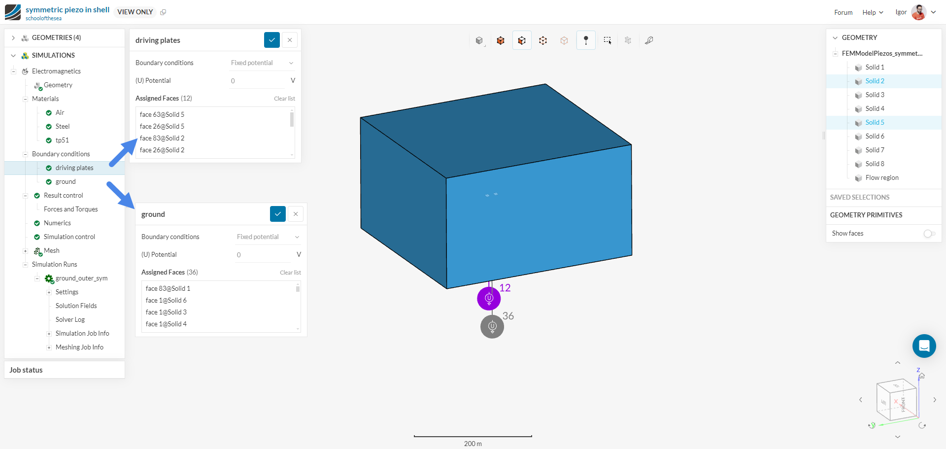 The upper and lower plates as well as the outer shell are held at V = 0 while the two middle plates are held at V = 300. When I solve for the fields, it always tells me that the fields everywhere are 0, which does not make any sense to me. Am I doing something wrong in my set-up? The project name is " symmetric piezo in shell"