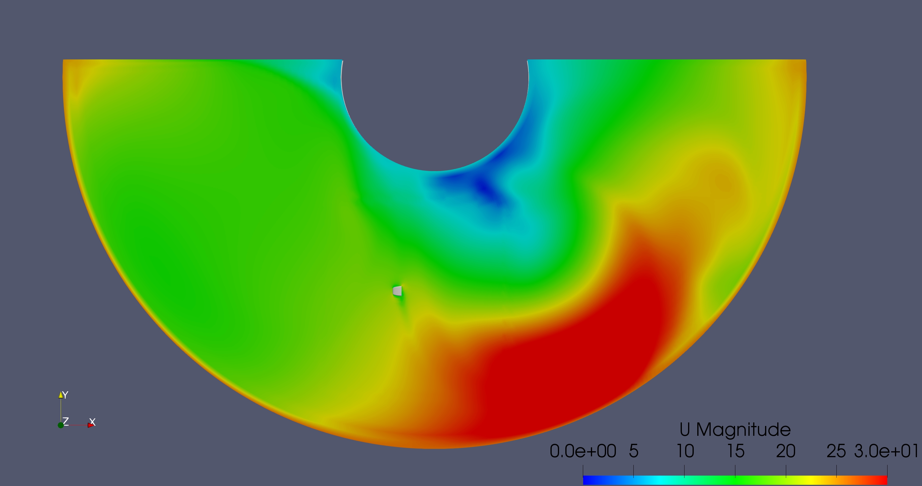 My approach on the setup of the case is to use a curved domain + MRF. The nose is rotating around a fixed point (0.765 9.125 0) outside of the domain at a constant angular velocity. The base mesh (region0) was defined as the cell zone. Some of the issues I’ve faced so far: