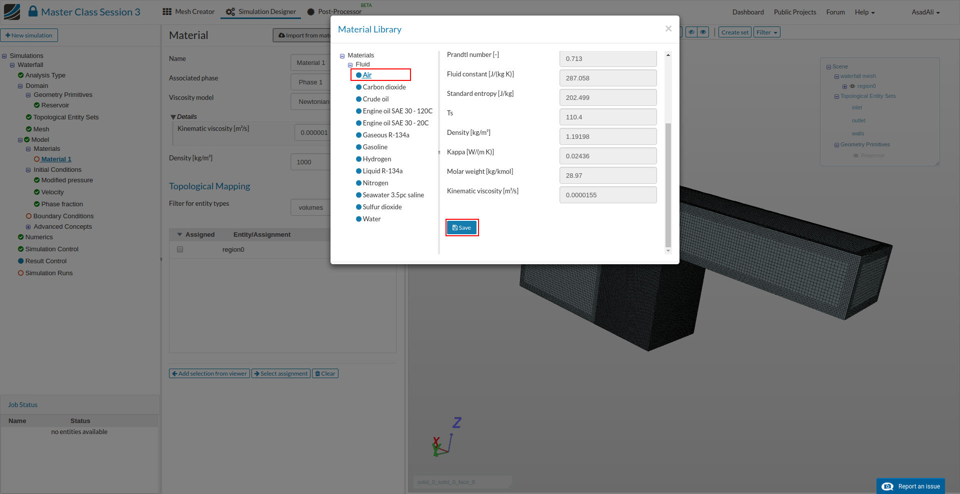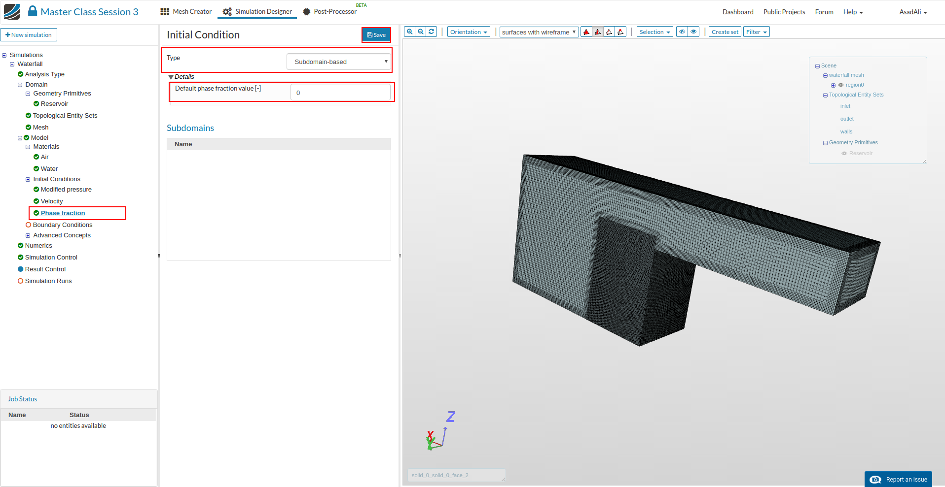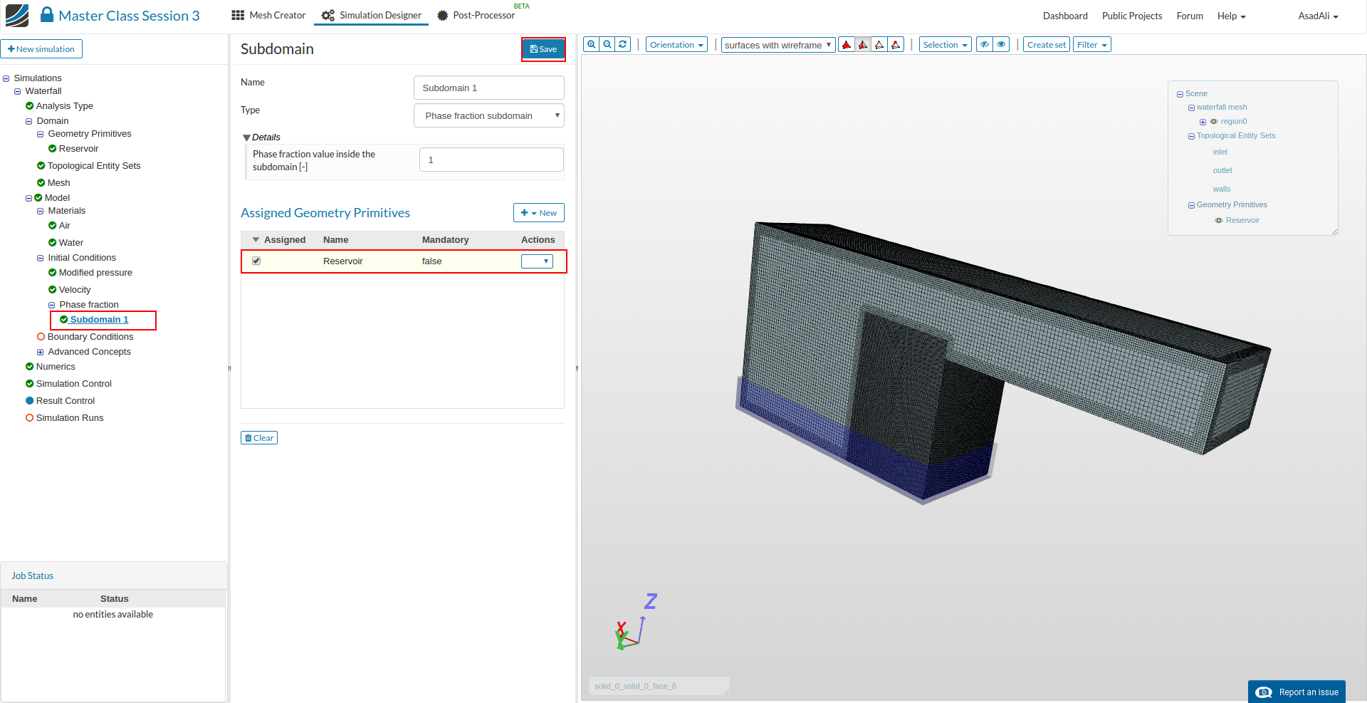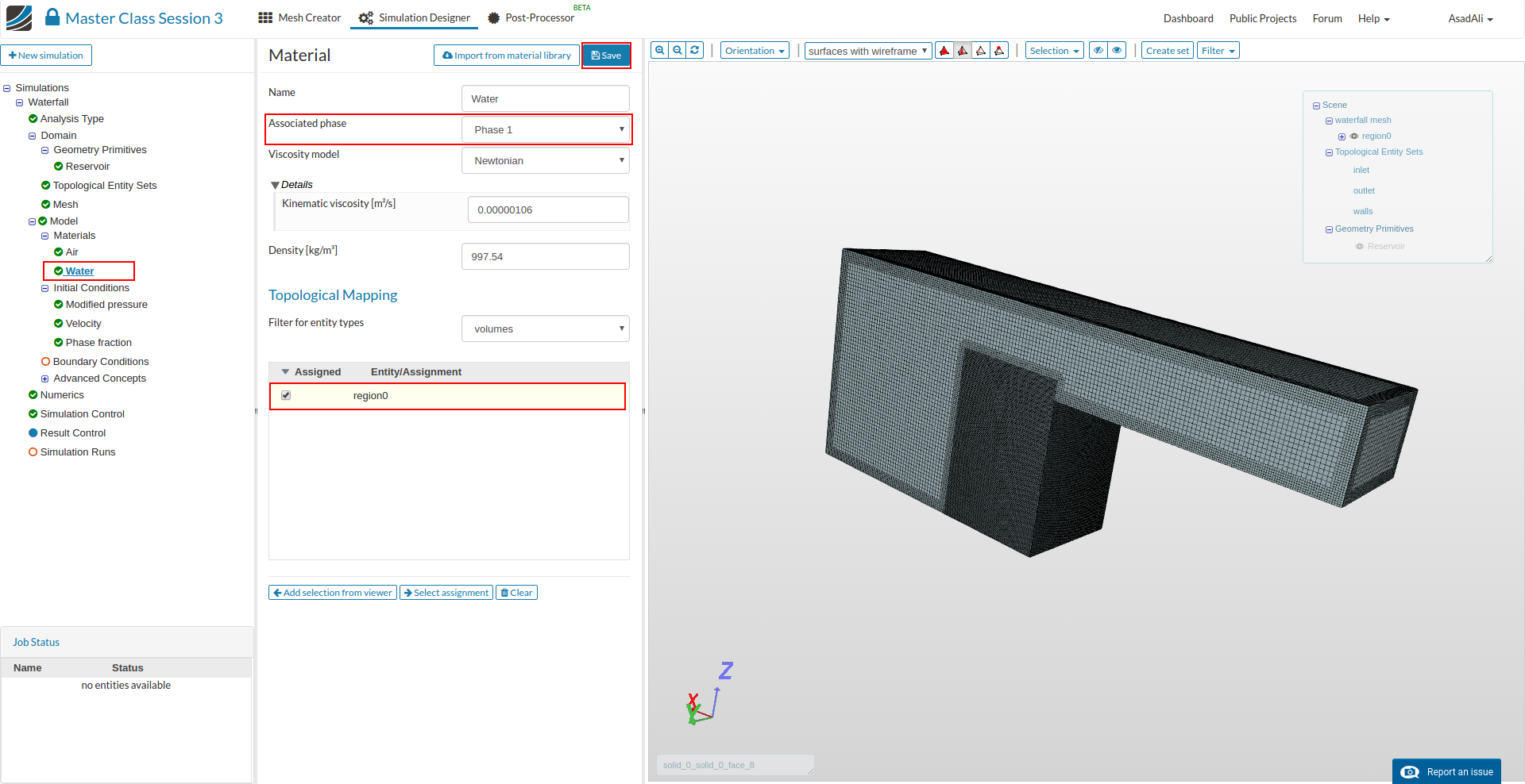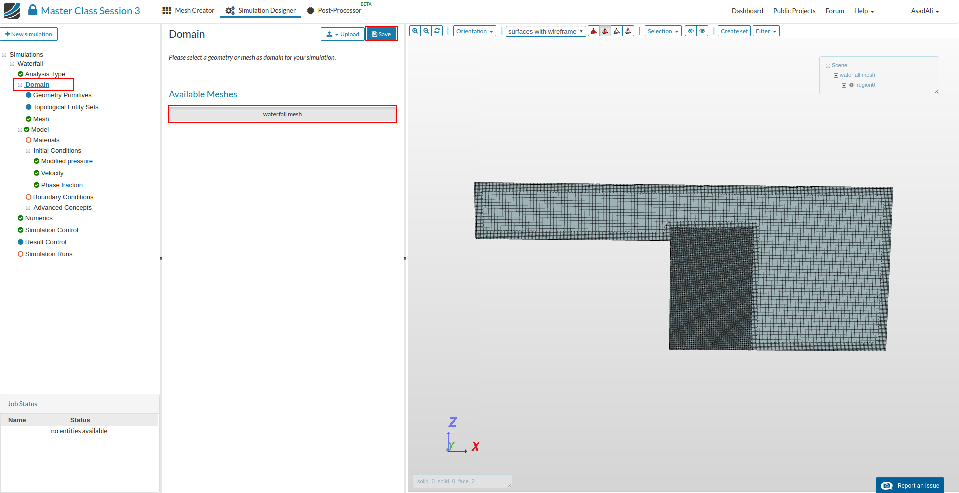 - Go to the Domain item in the Project Tree and assign the mesh. Save the selection. For this simulation we will use the waterfall mesh domain that we just created.