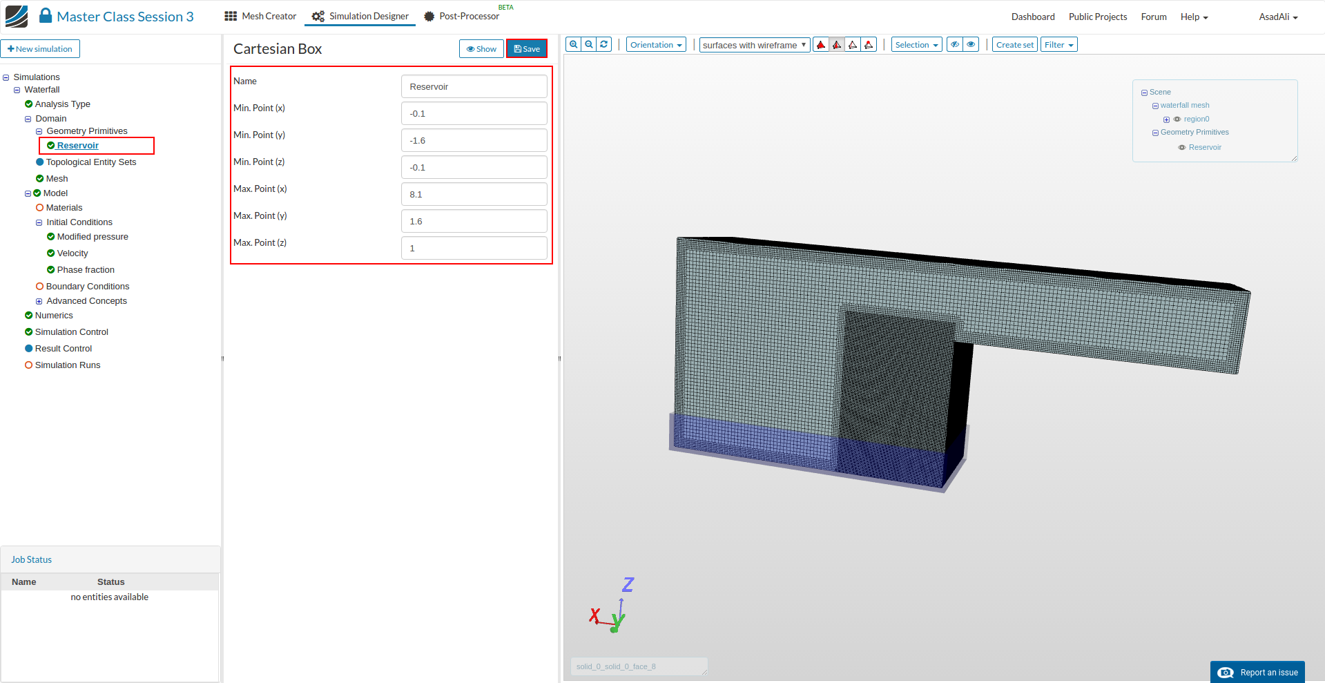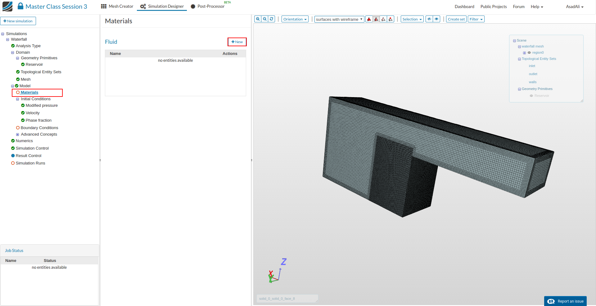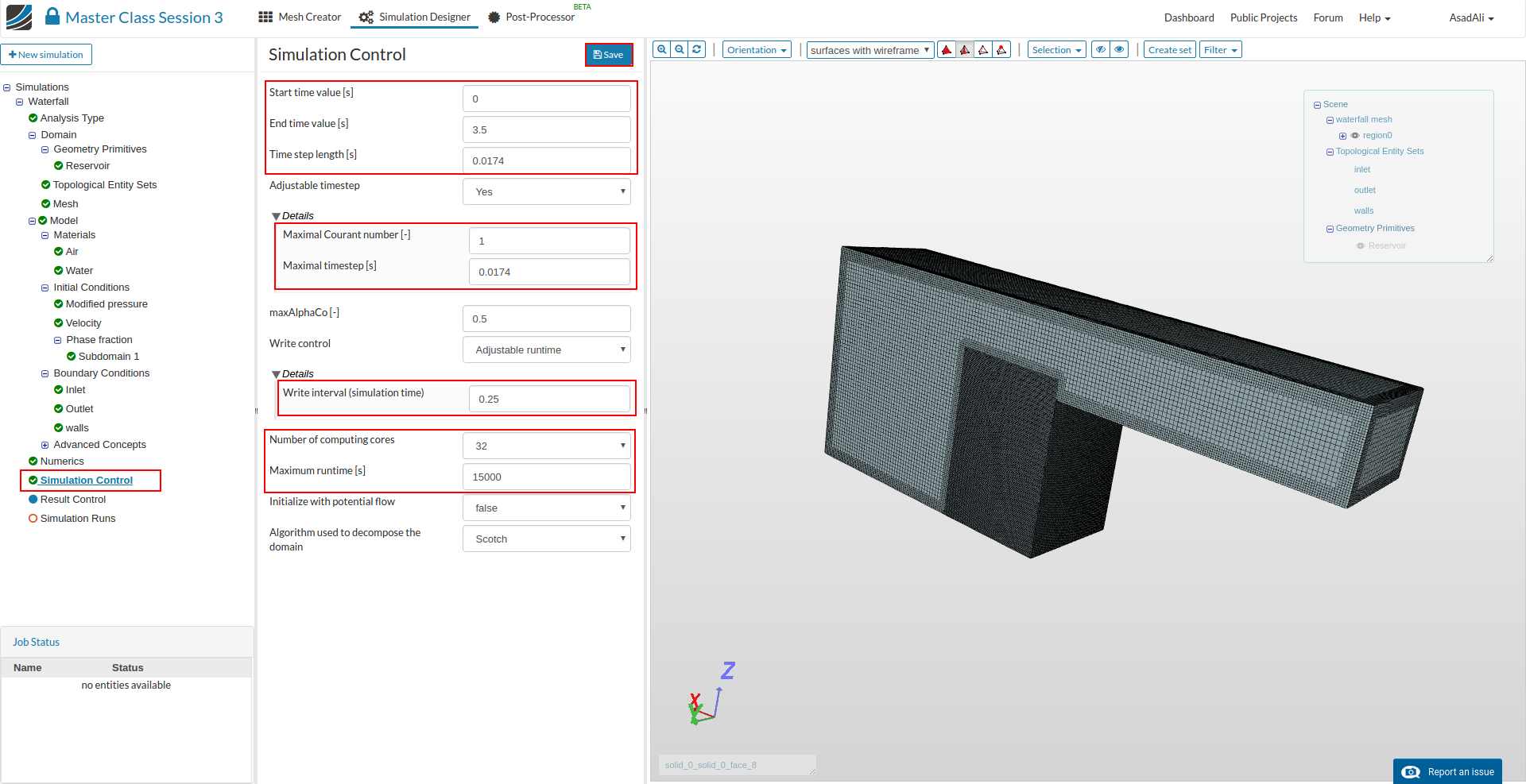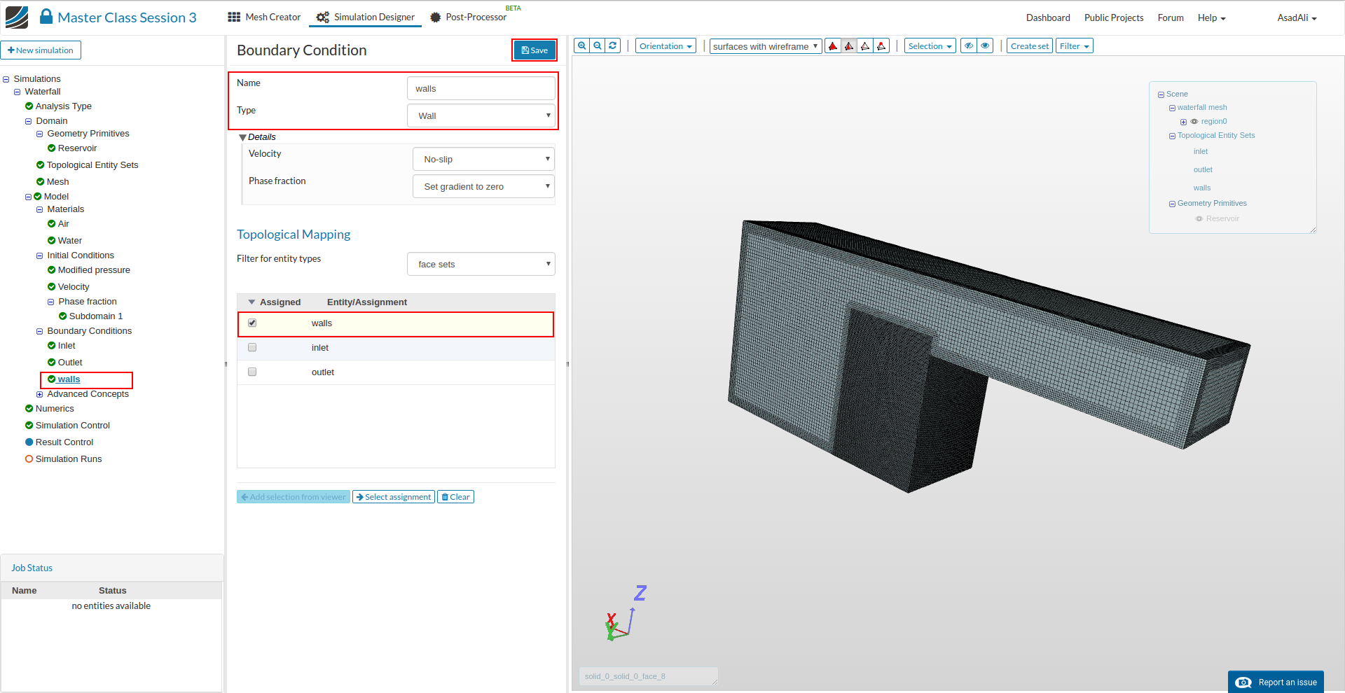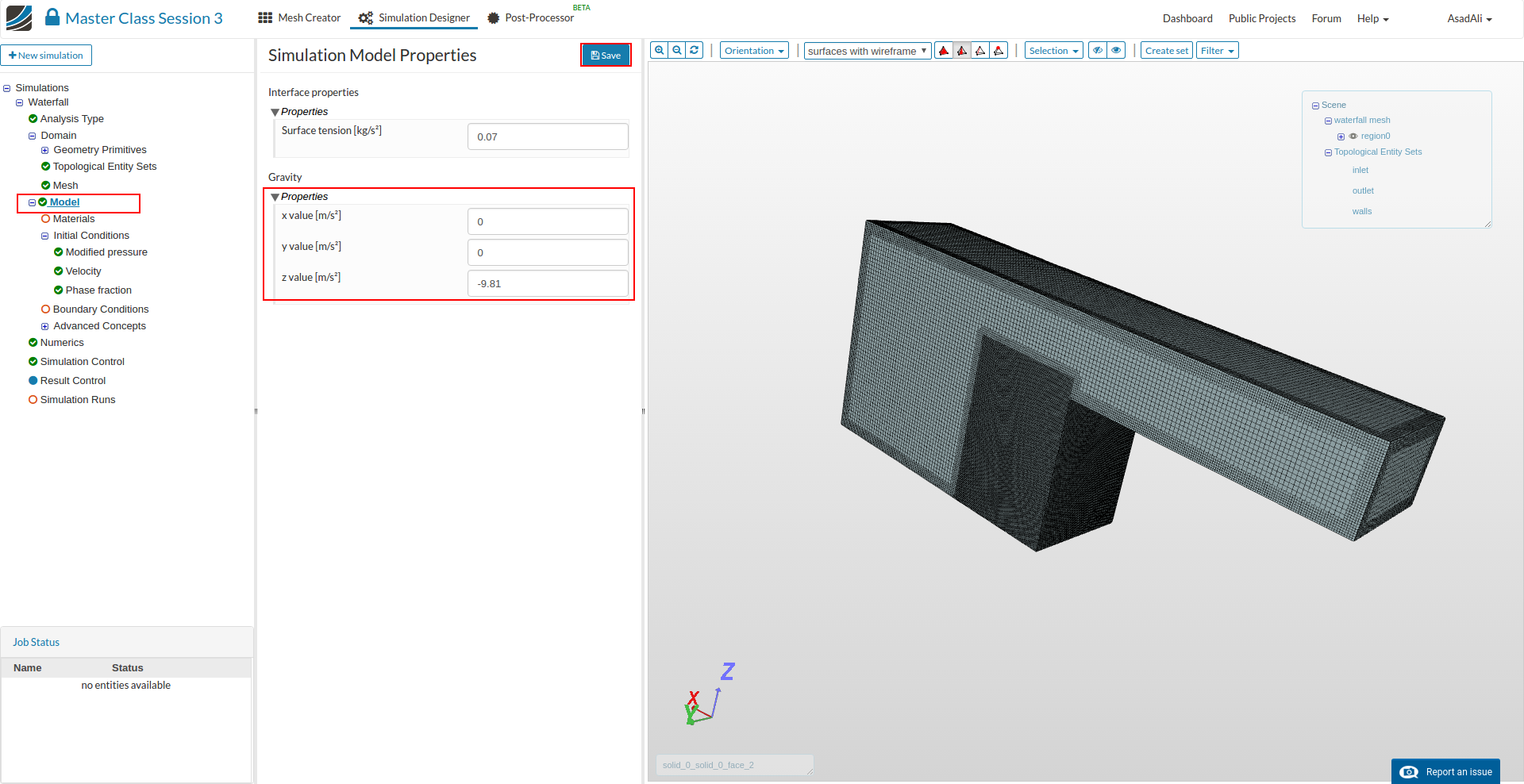 - Go to the Domain item in the Project Tree and assign the mesh. Save the selection. For this simulation we will use the waterfall mesh domain that we just created.