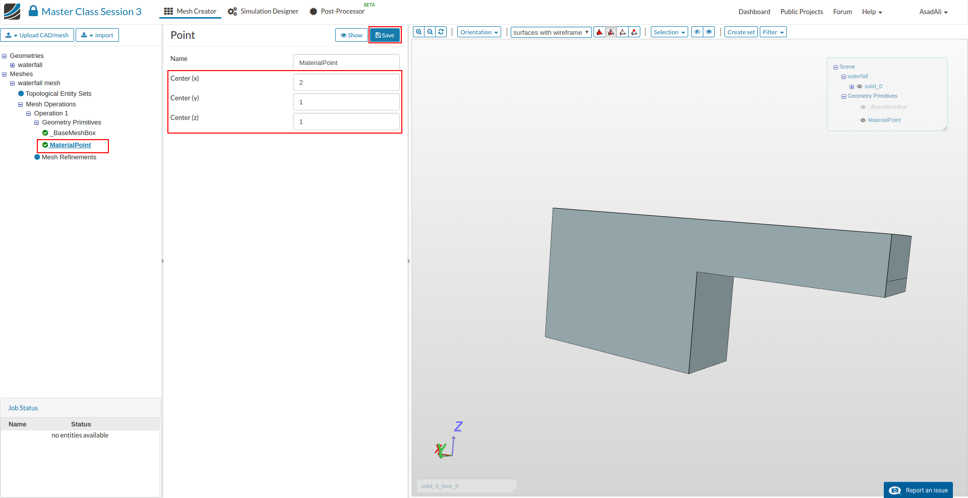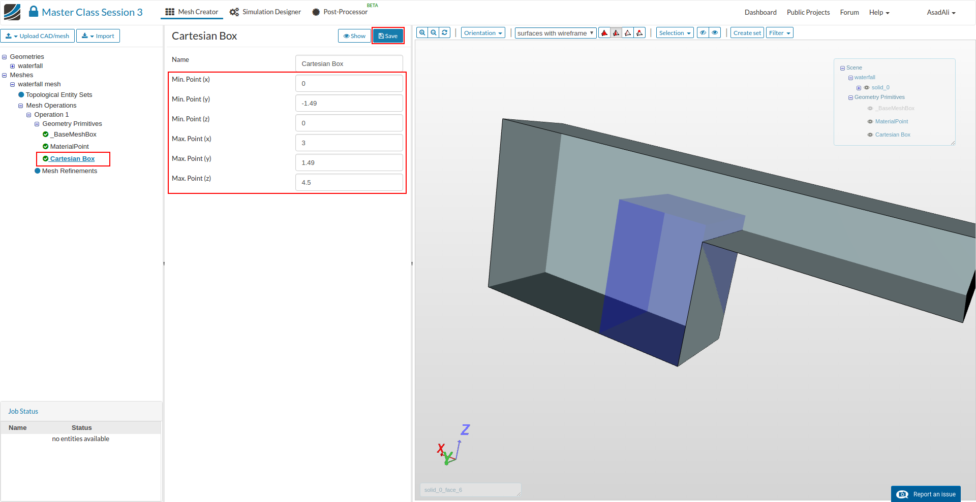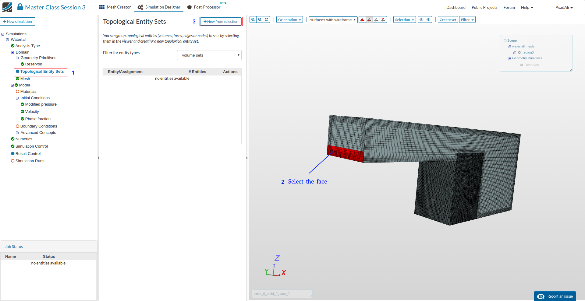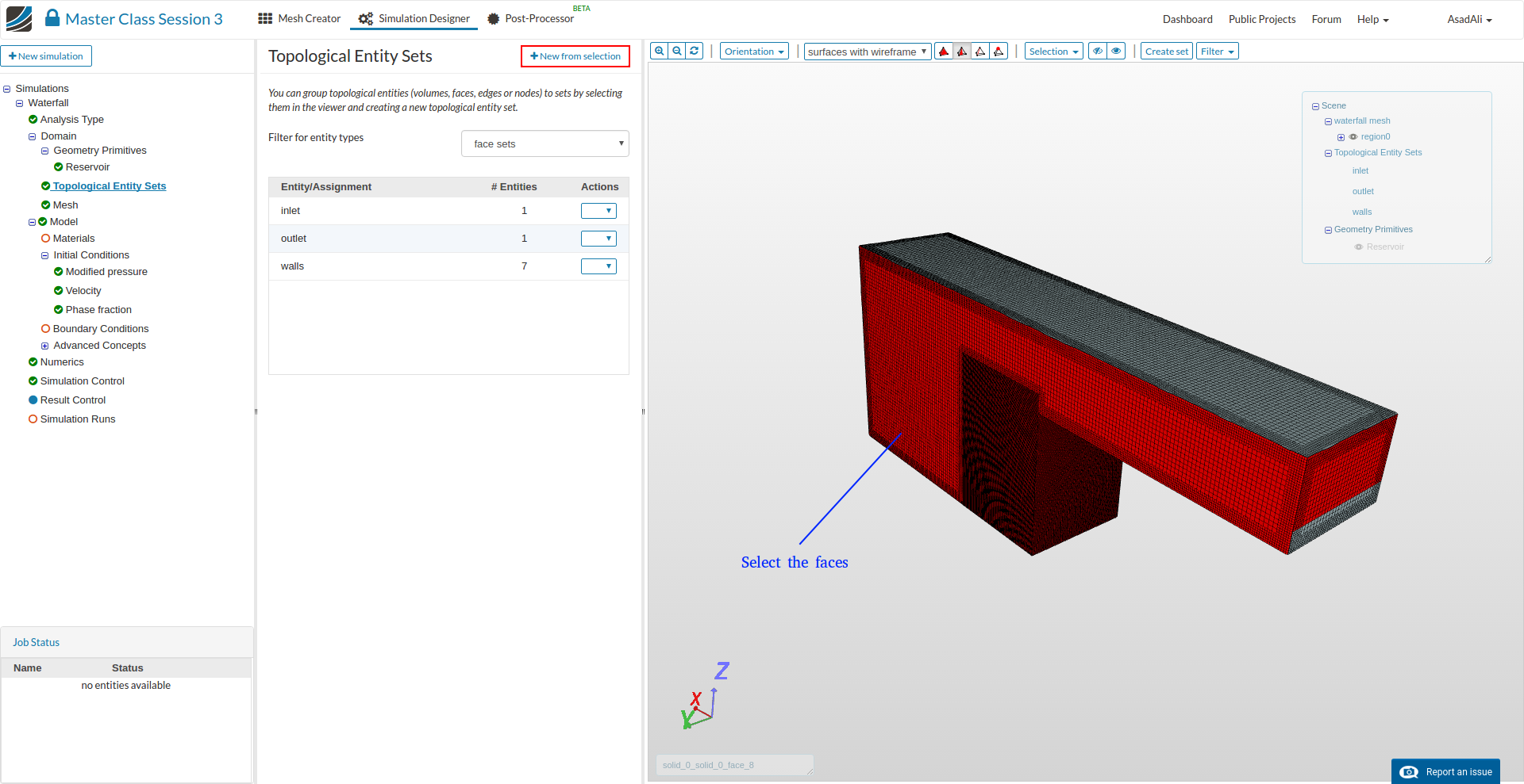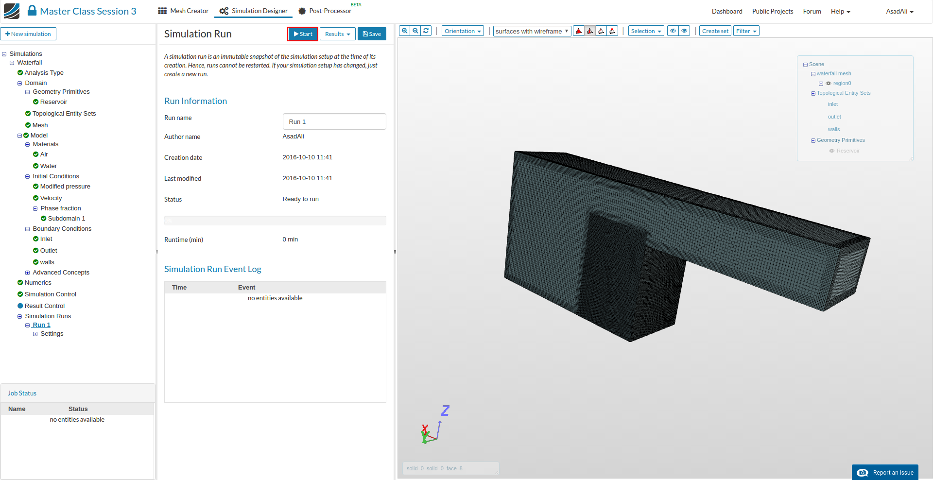 - Go to the Domain item in the Project Tree and assign the mesh. Save the selection. For this simulation we will use the waterfall mesh domain that we just created.