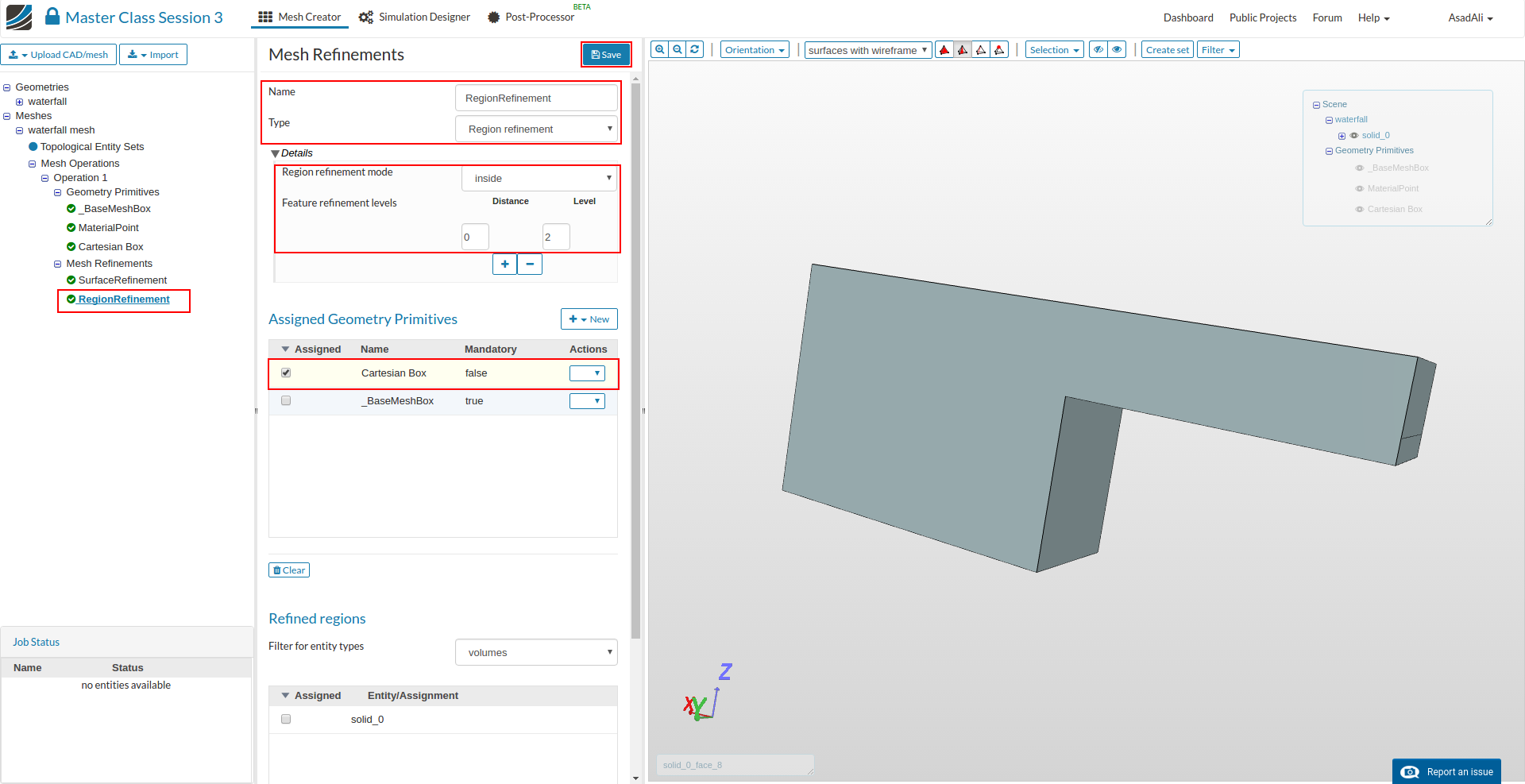- Similarly add another mesh refinement and name it "RegionRefinement, change the type to Region Refinement. Set the refinement level and assign the refinement to your Cartesian Box geometry primitive. Save the selection.