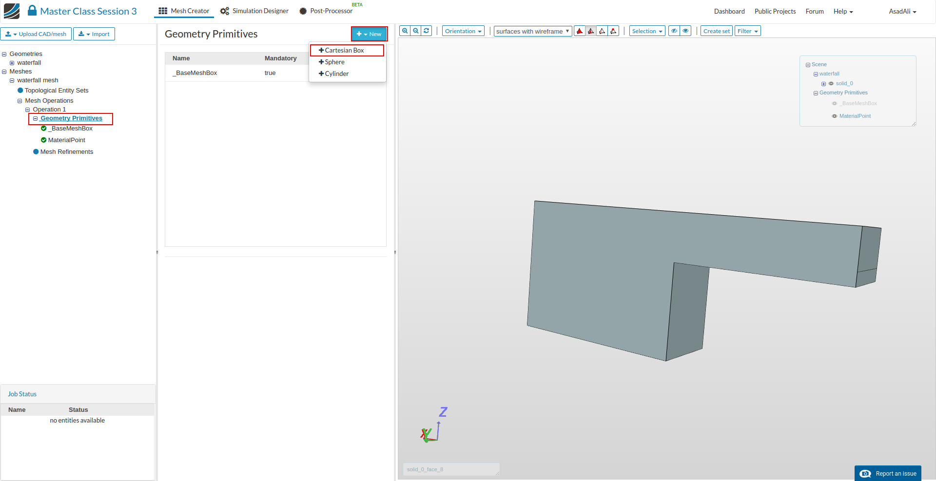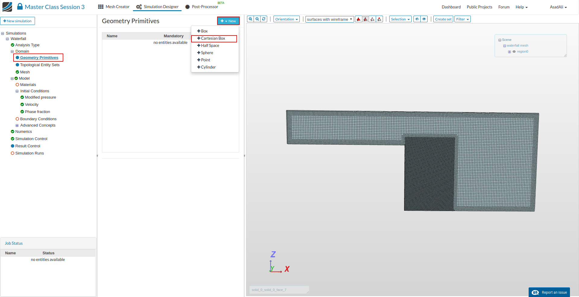 - We want to make mesh refinements as well. To do this, we will create a Cartesian box. Go to the Geometry Primitives item, press New and select Cartesian Box.