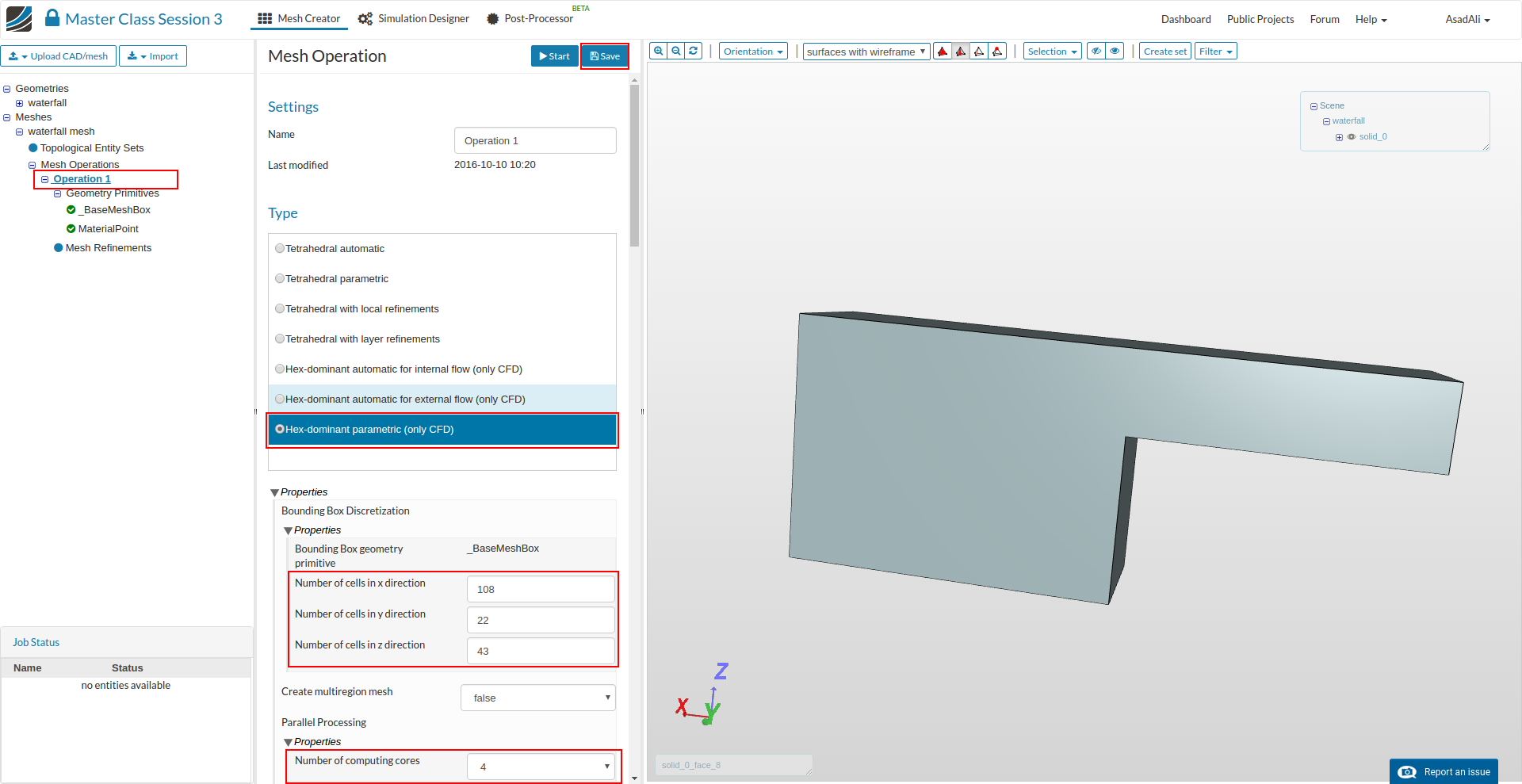 - We will make a fine mesh for this geometry by using the manual Hex-Dominant meshing algorithm. Move to the Hex-dominant parametric (only CFD) in the mesh setup, set the number of cells in the x,y,z directions to 108, 22, and 43 respectively and set the number of cores to 4 for this job.